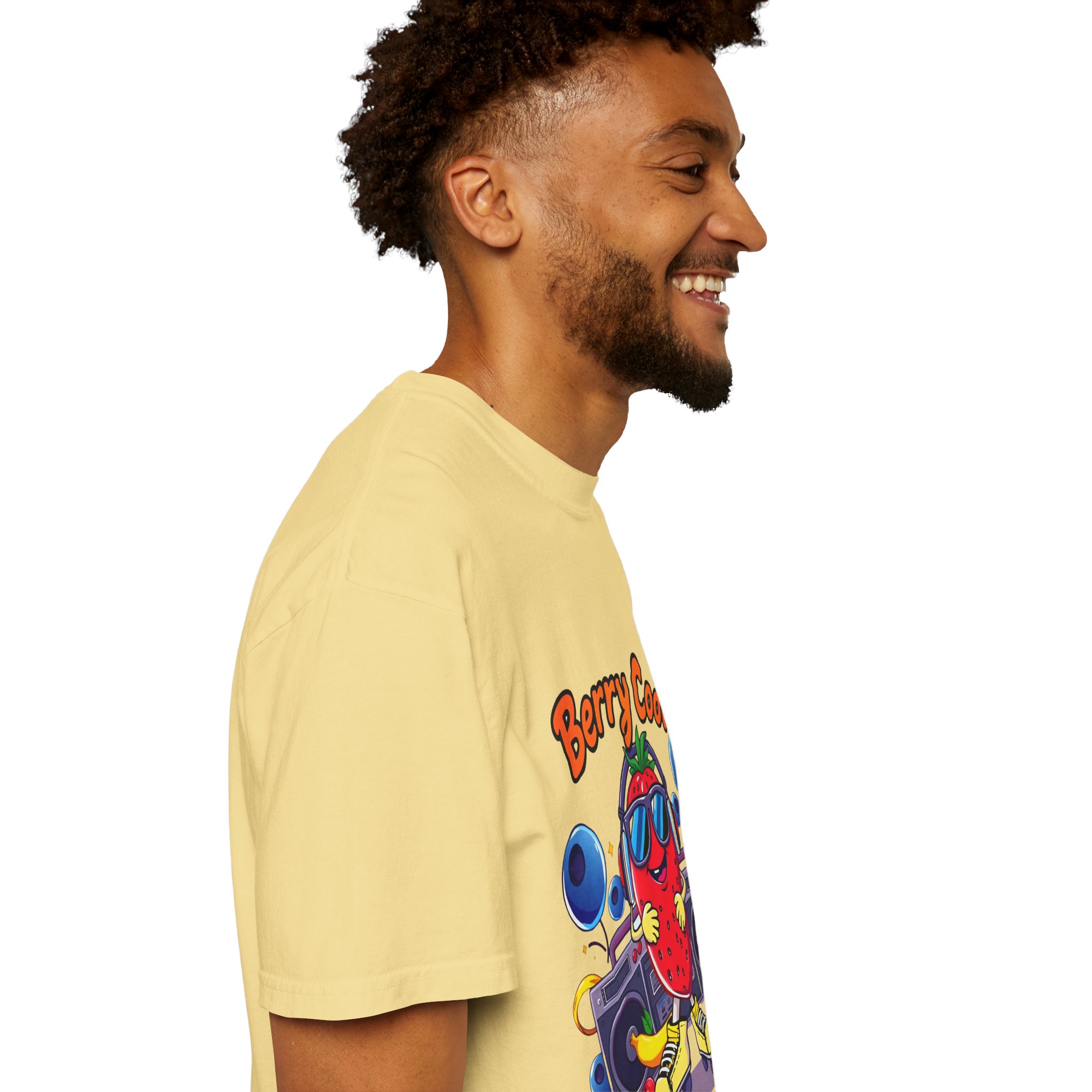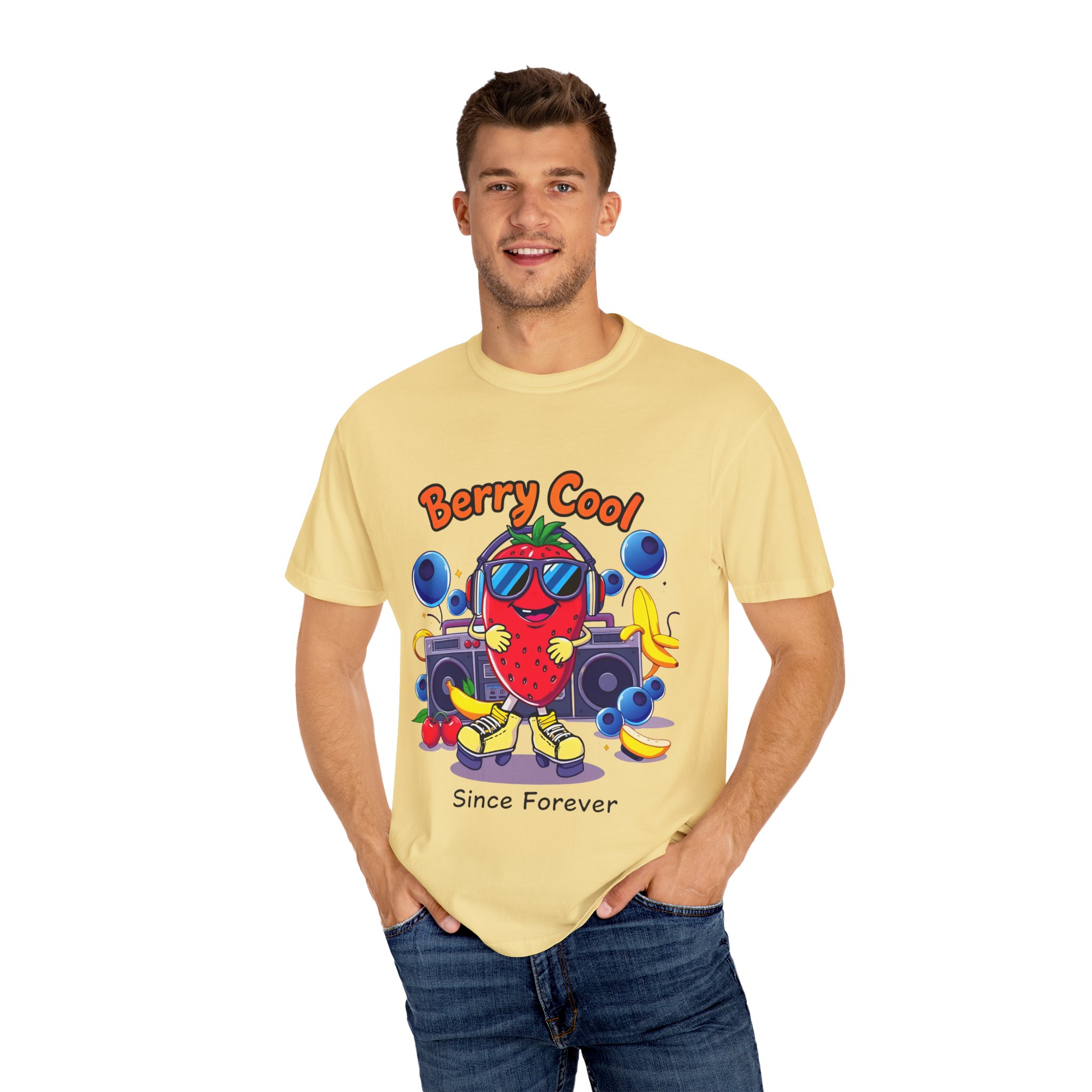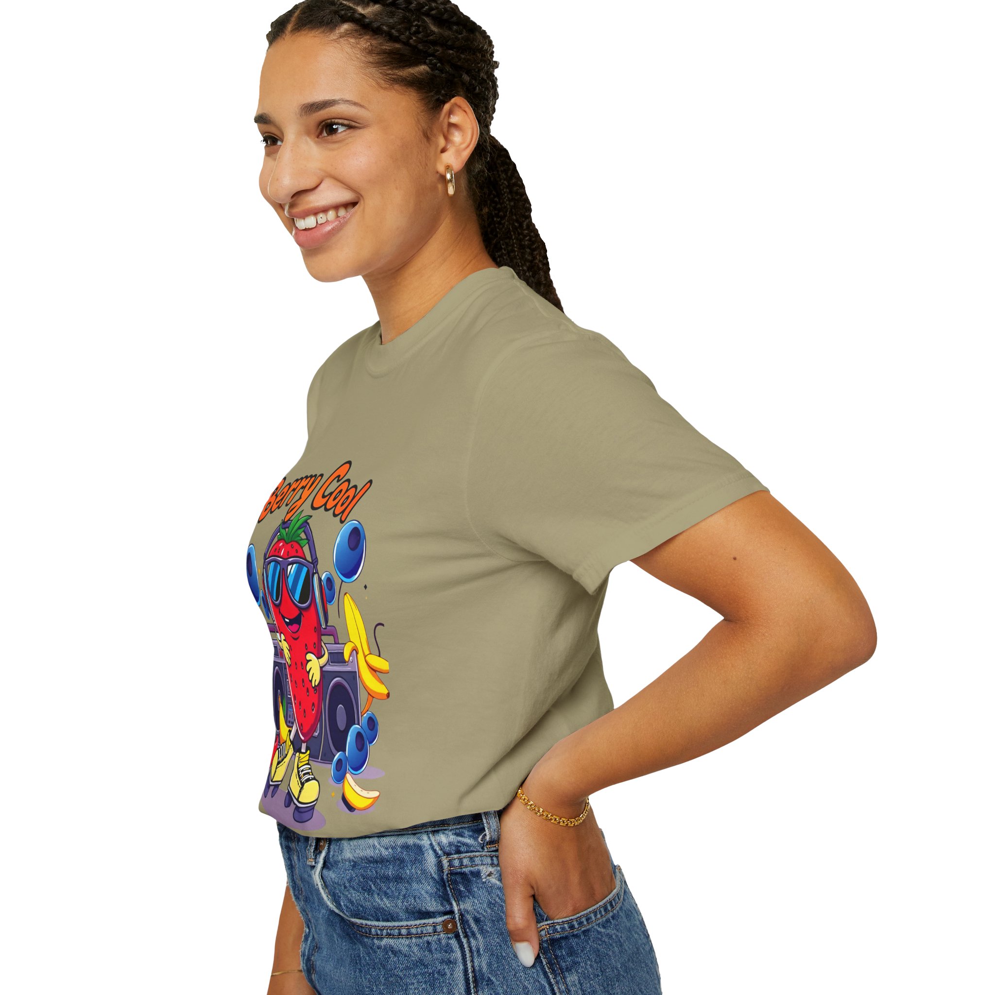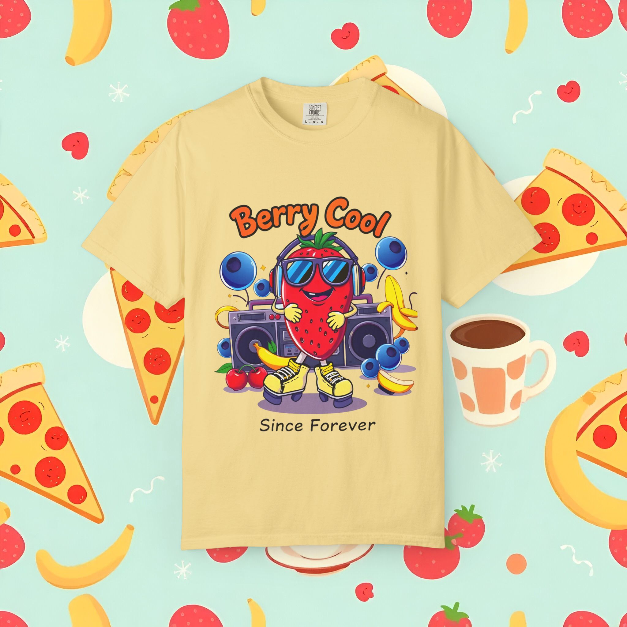 The Berry Cool T-Shirt has a relaxed, true-to-size fit. If you prefer a roomier streetwear look, size up once; for a closer fit, choose your usual size. Pair it with denim shorts, cargos, or a flowy skirt; throw on a flannel or lightweight jacket for cool evenings. Its sunny palette plays nicely with neutrals and bold colors alike, making it a versatile graphic tee for any season.