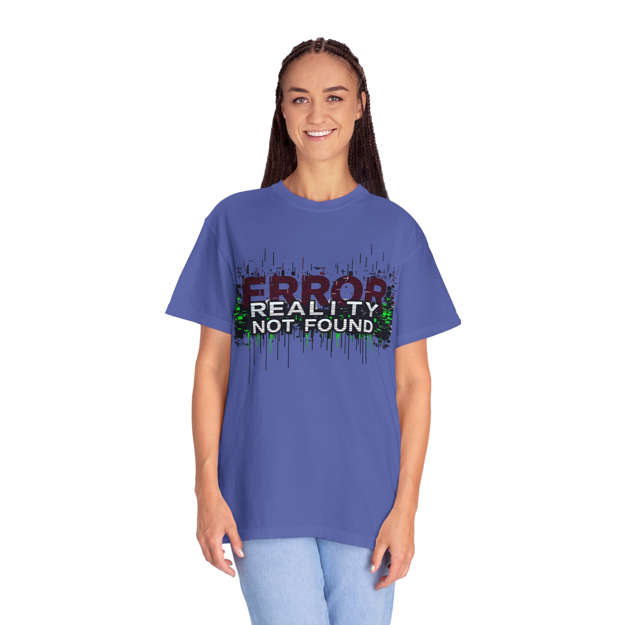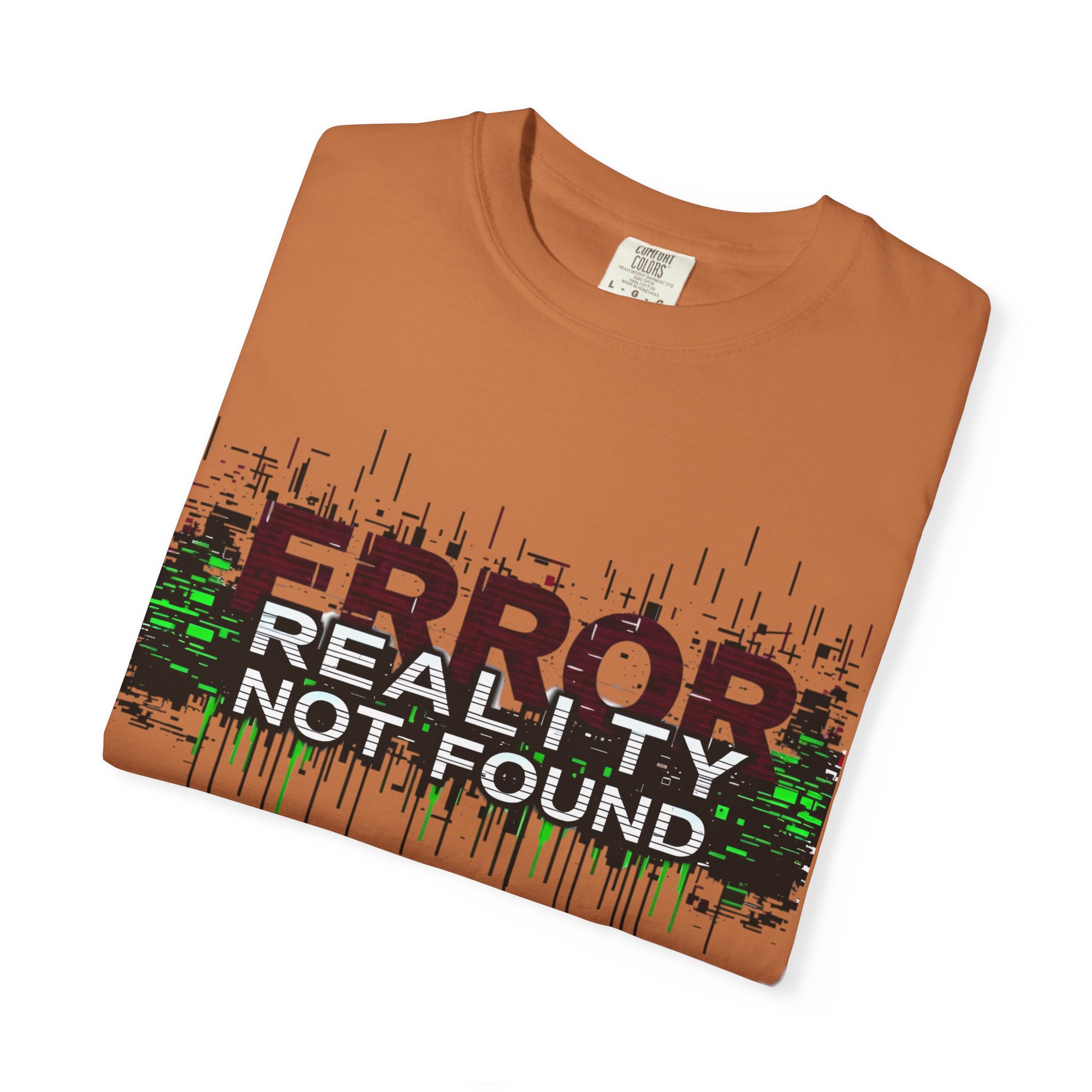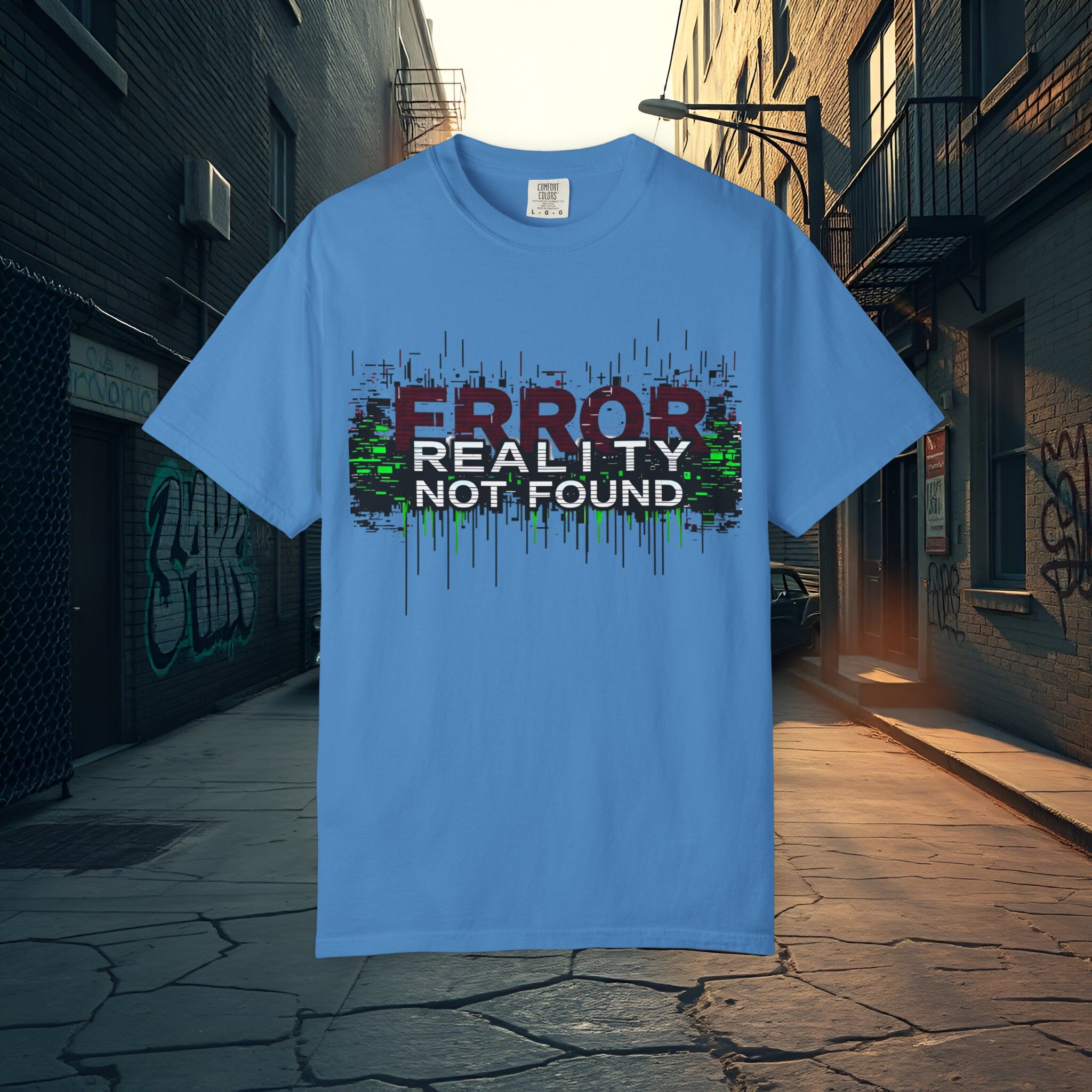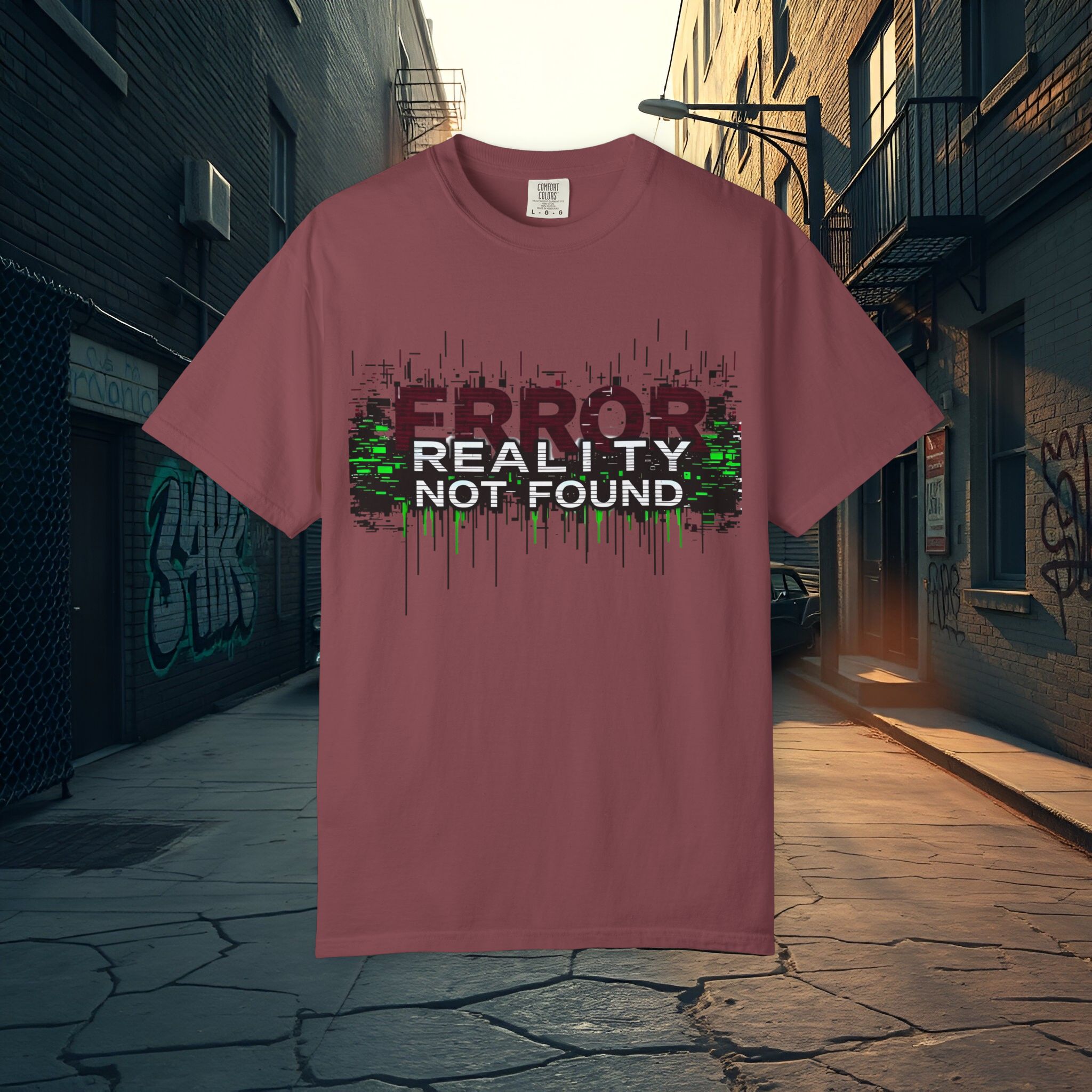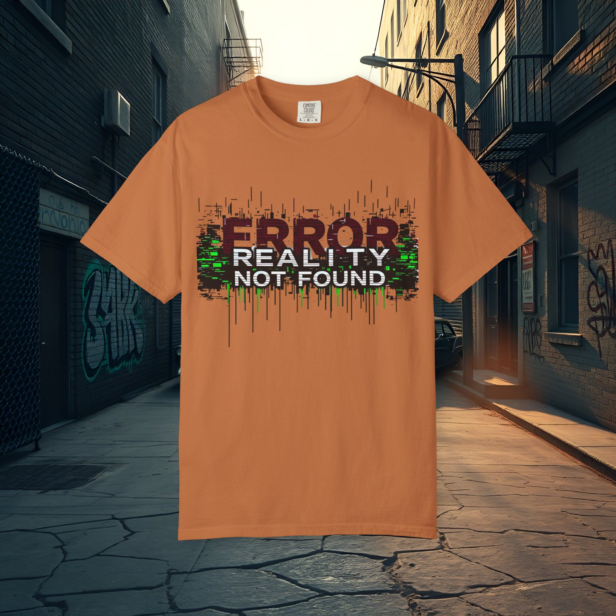 error reality not found t-shirt is the perfect blend of tech humor and vintage comfort. The bold “ERROR: REALITY NOT FOUND” print plays on 404 culture and simulation jokes, making this tee a standout gift for gamers, coders, and meme fans. Because each garment is garment-dyed and prewashed, every shirt has subtle tonal variations that give it a unique, lived-in character.