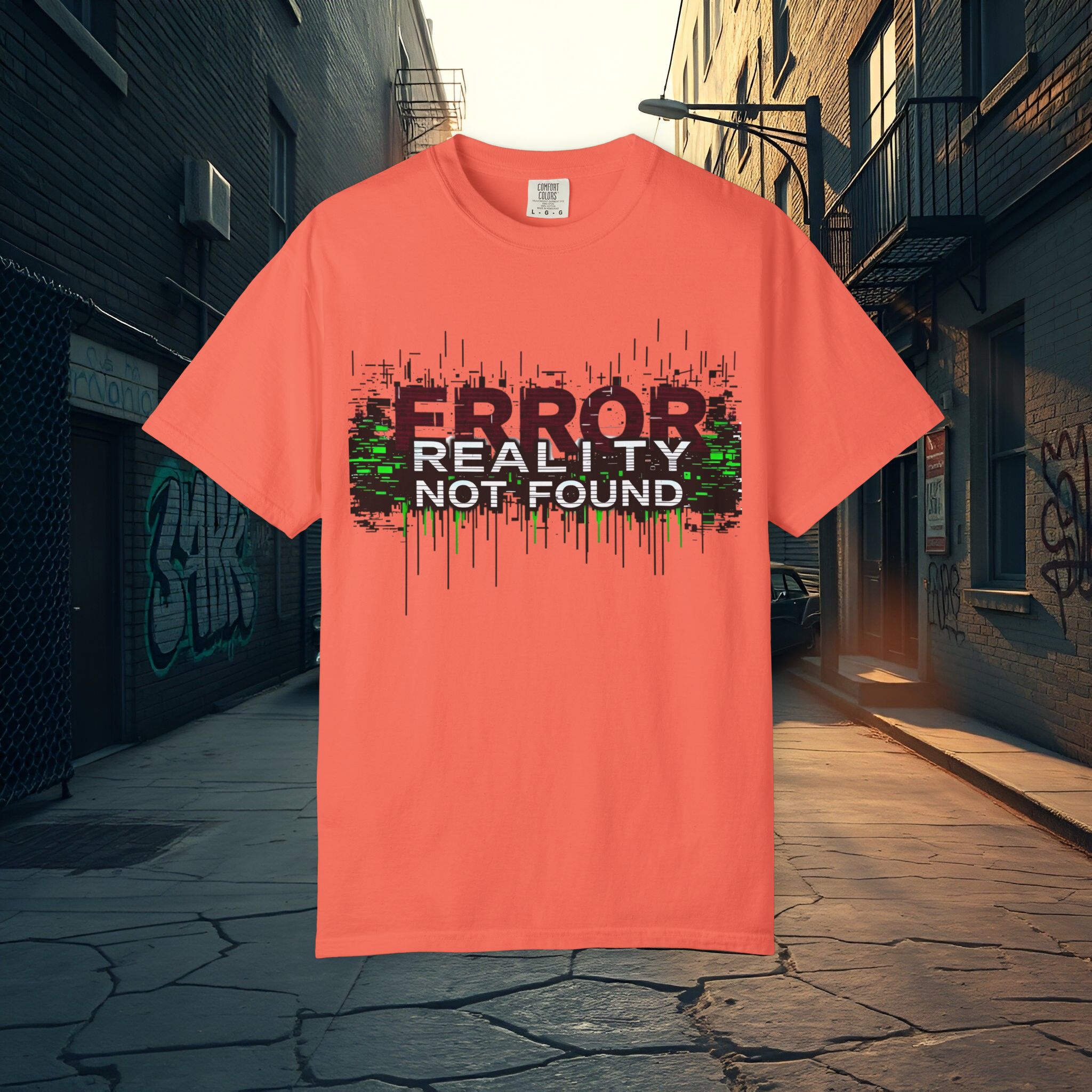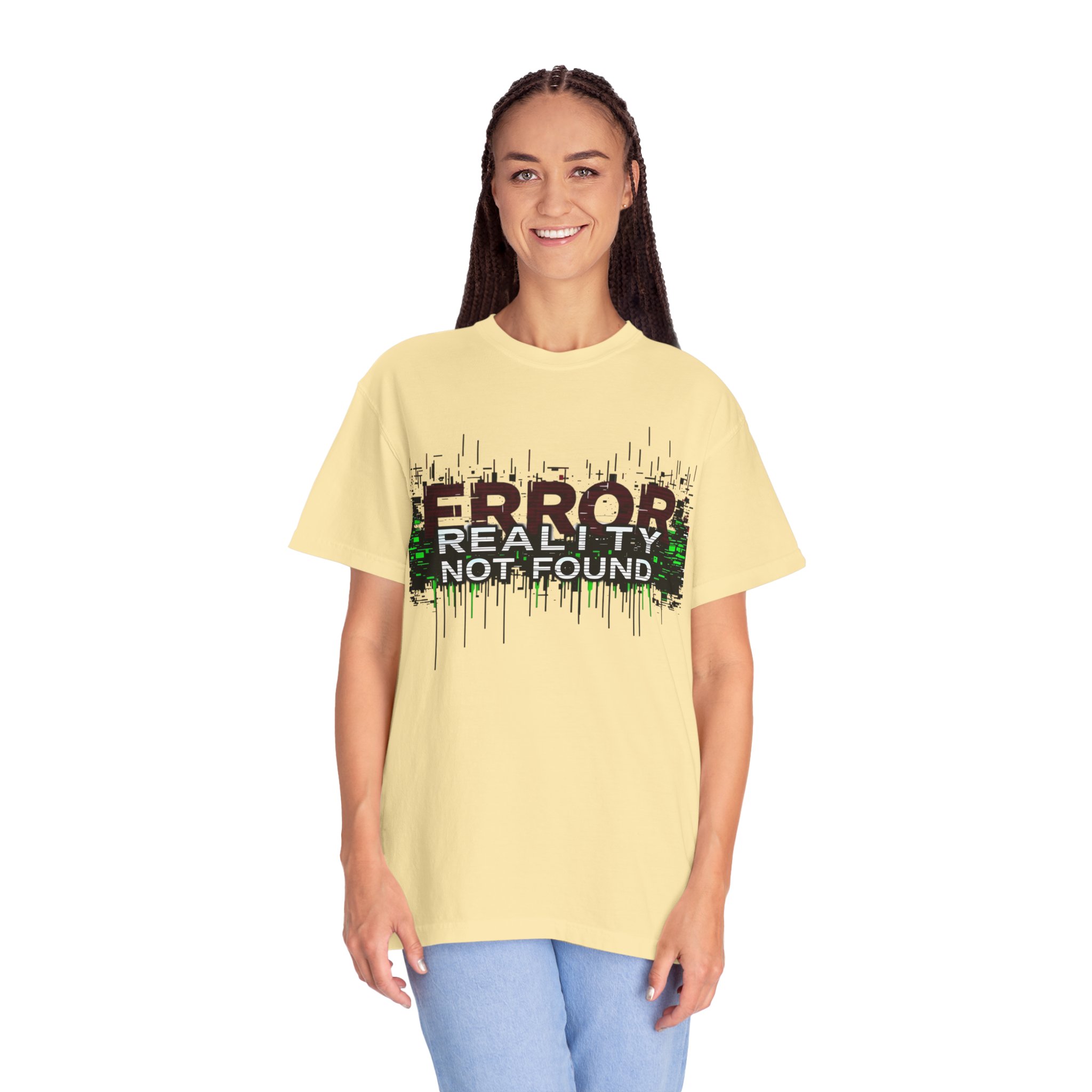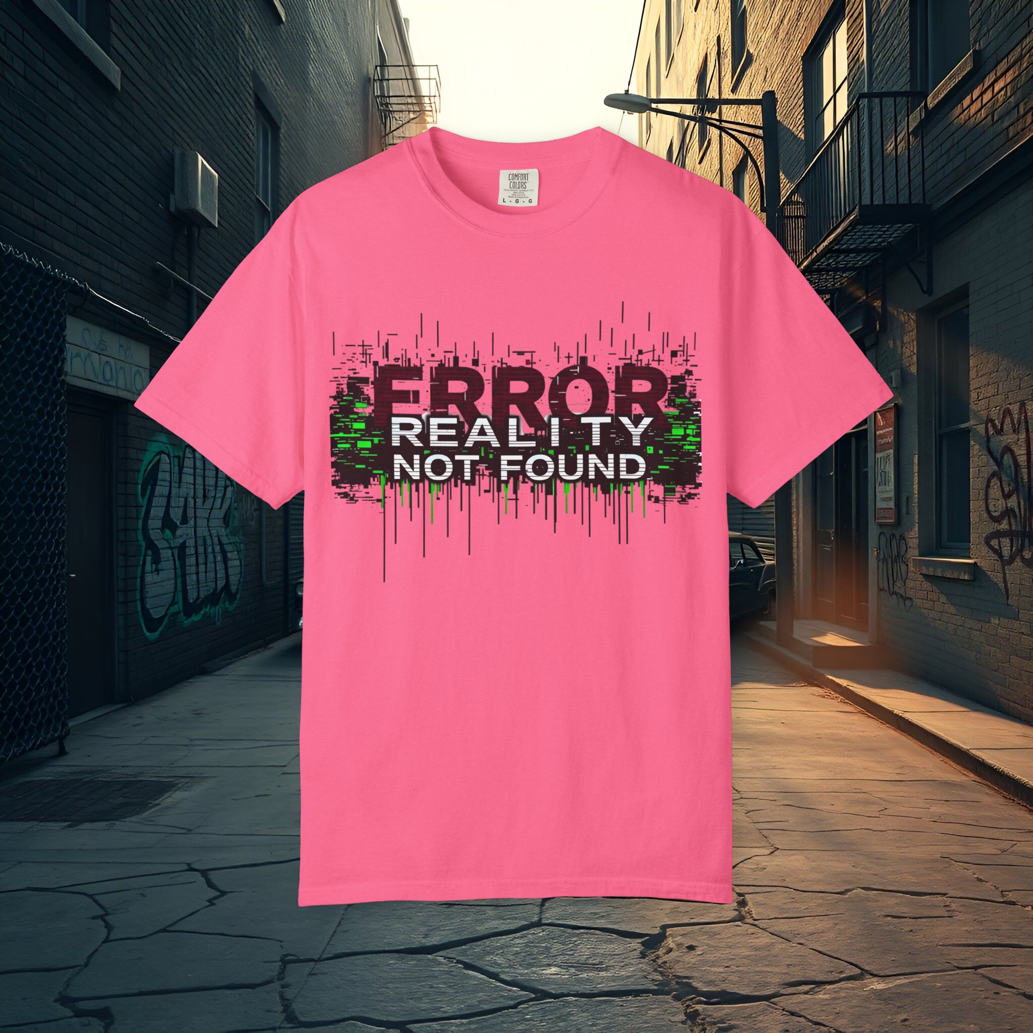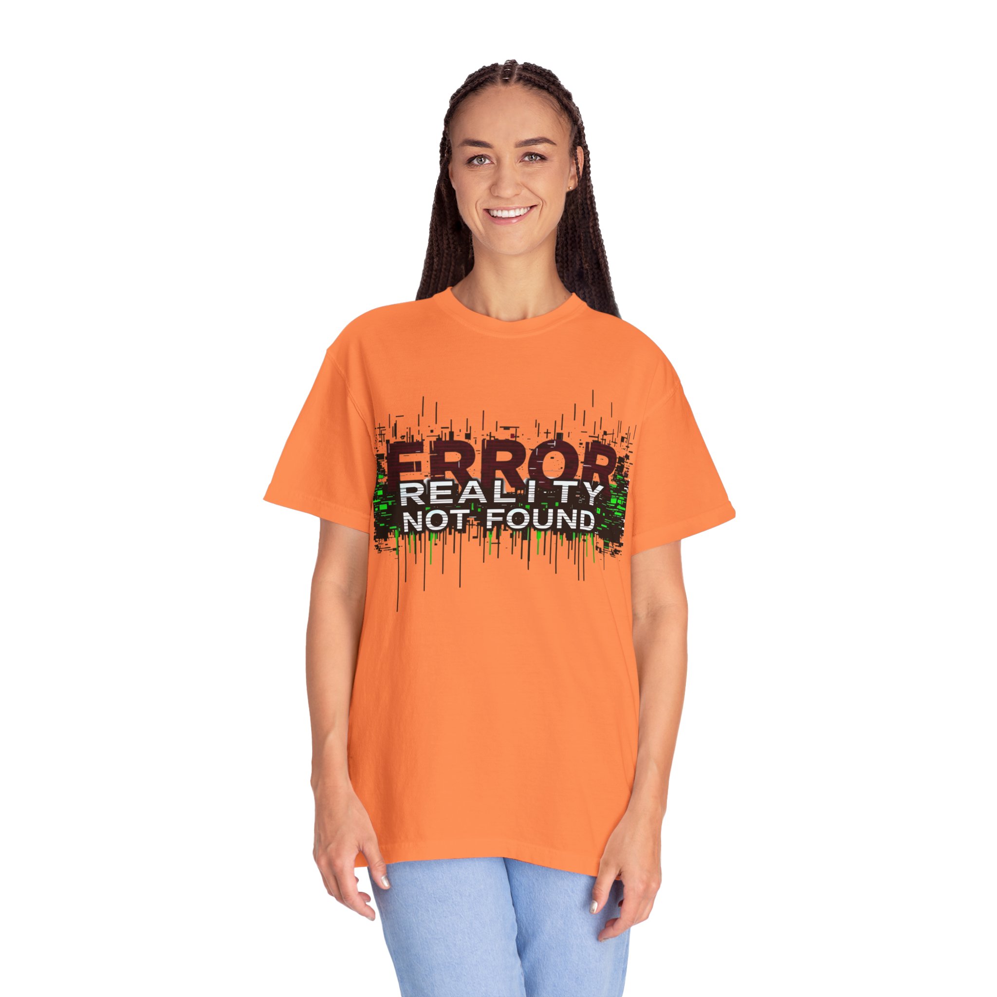 error reality not found t-shirt is the perfect blend of tech humor and vintage comfort. The bold “ERROR: REALITY NOT FOUND” print plays on 404 culture and simulation jokes, making this tee a standout gift for gamers, coders, and meme fans. Because each garment is garment-dyed and prewashed, every shirt has subtle tonal variations that give it a unique, lived-in character.
