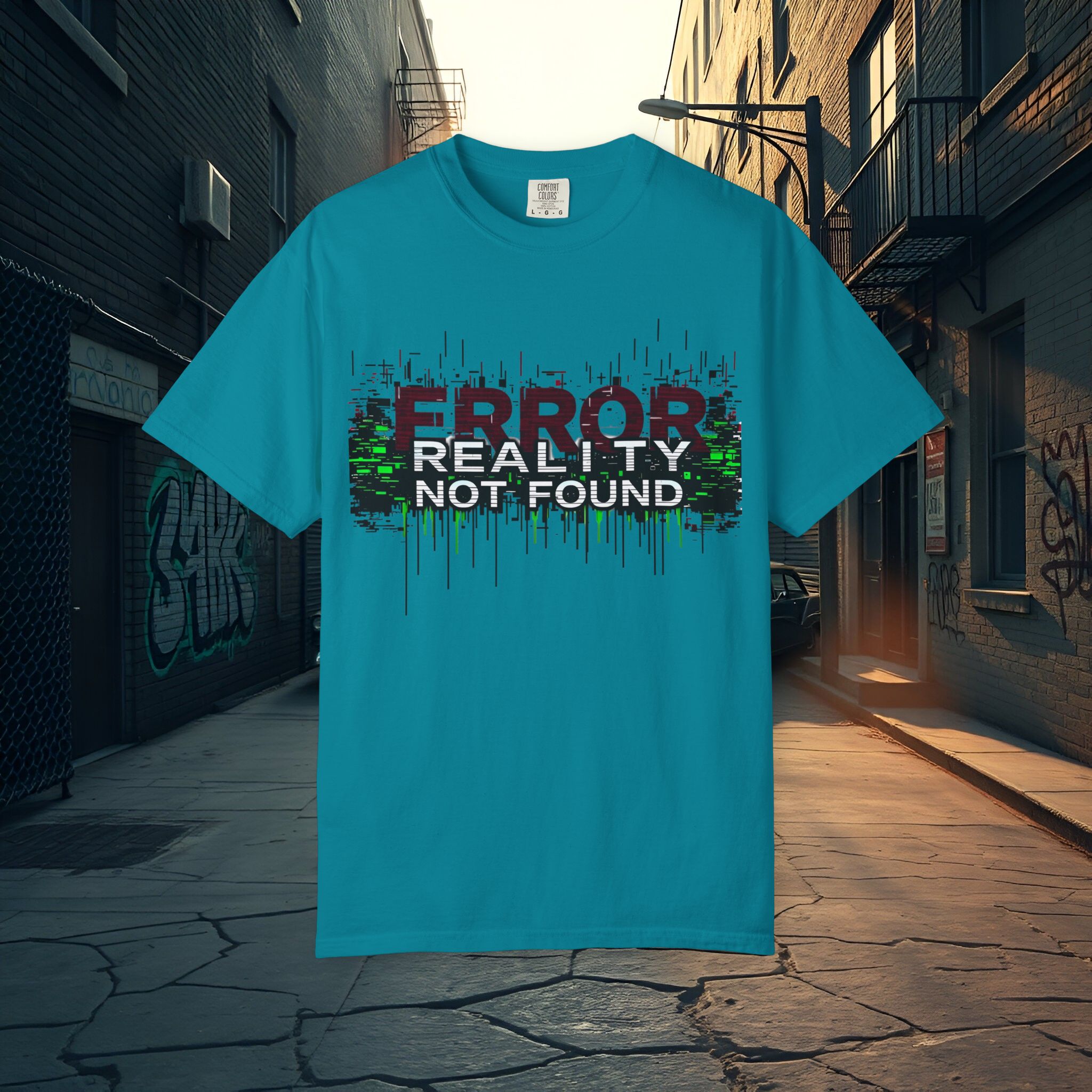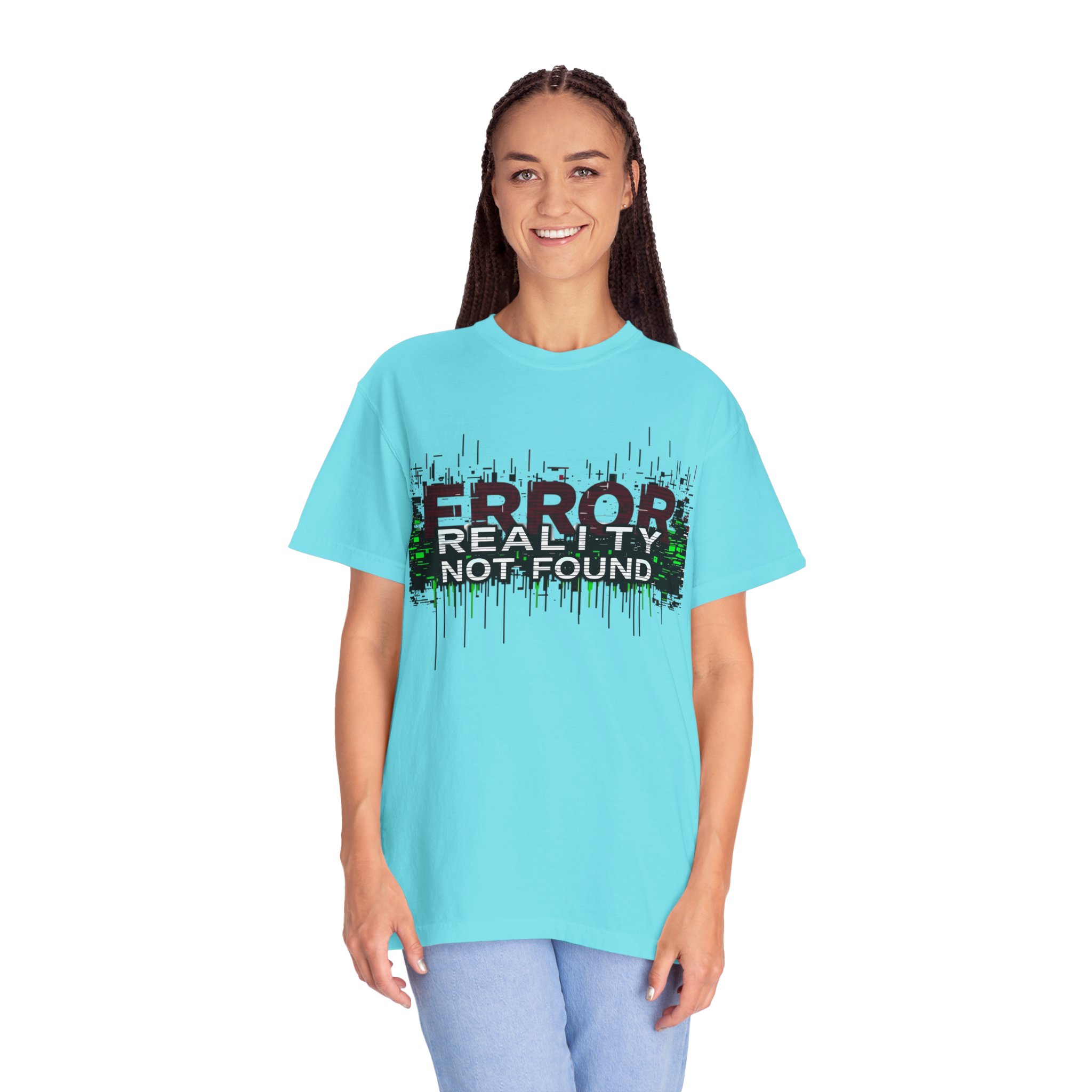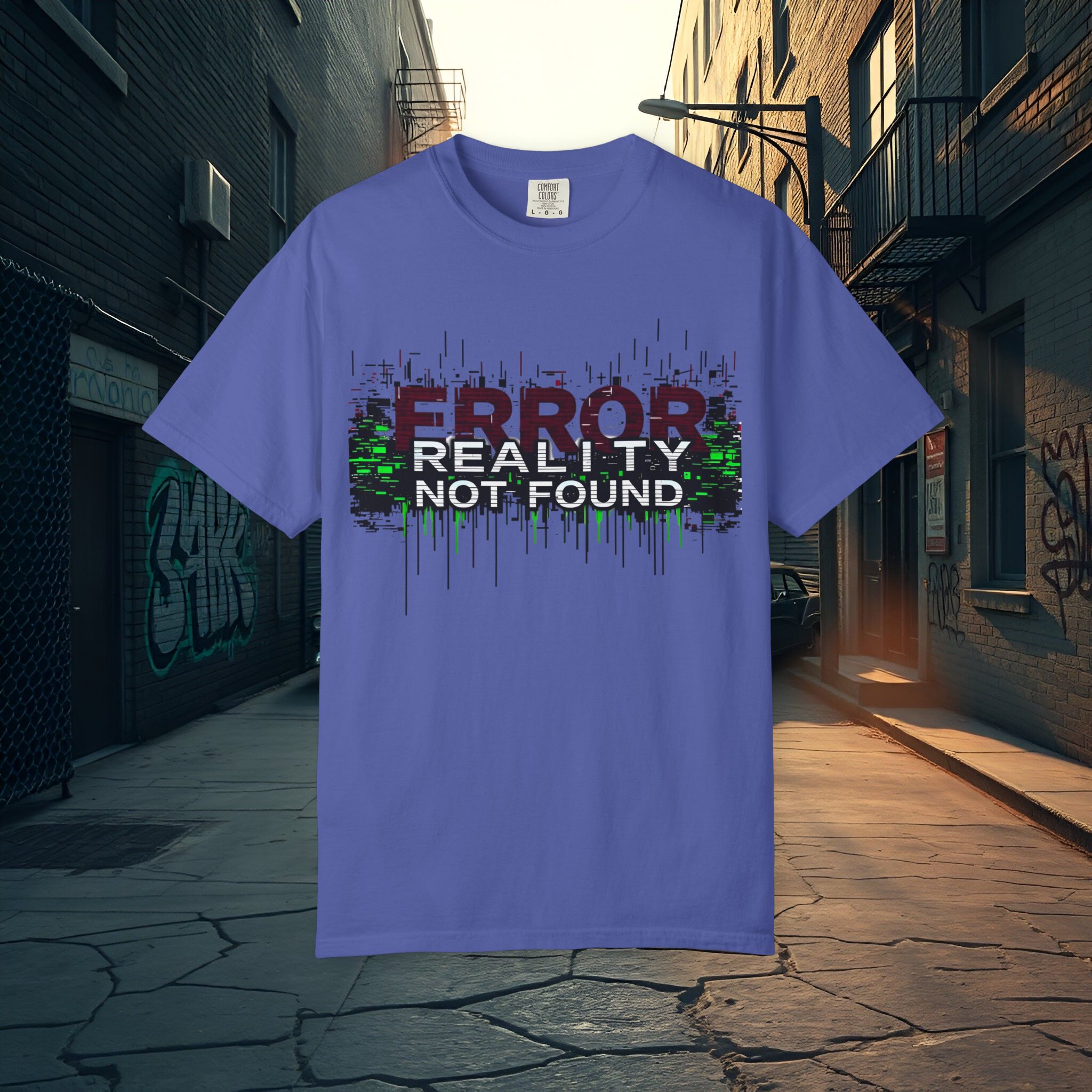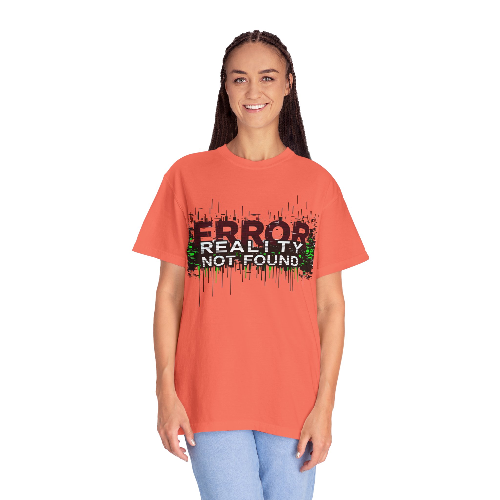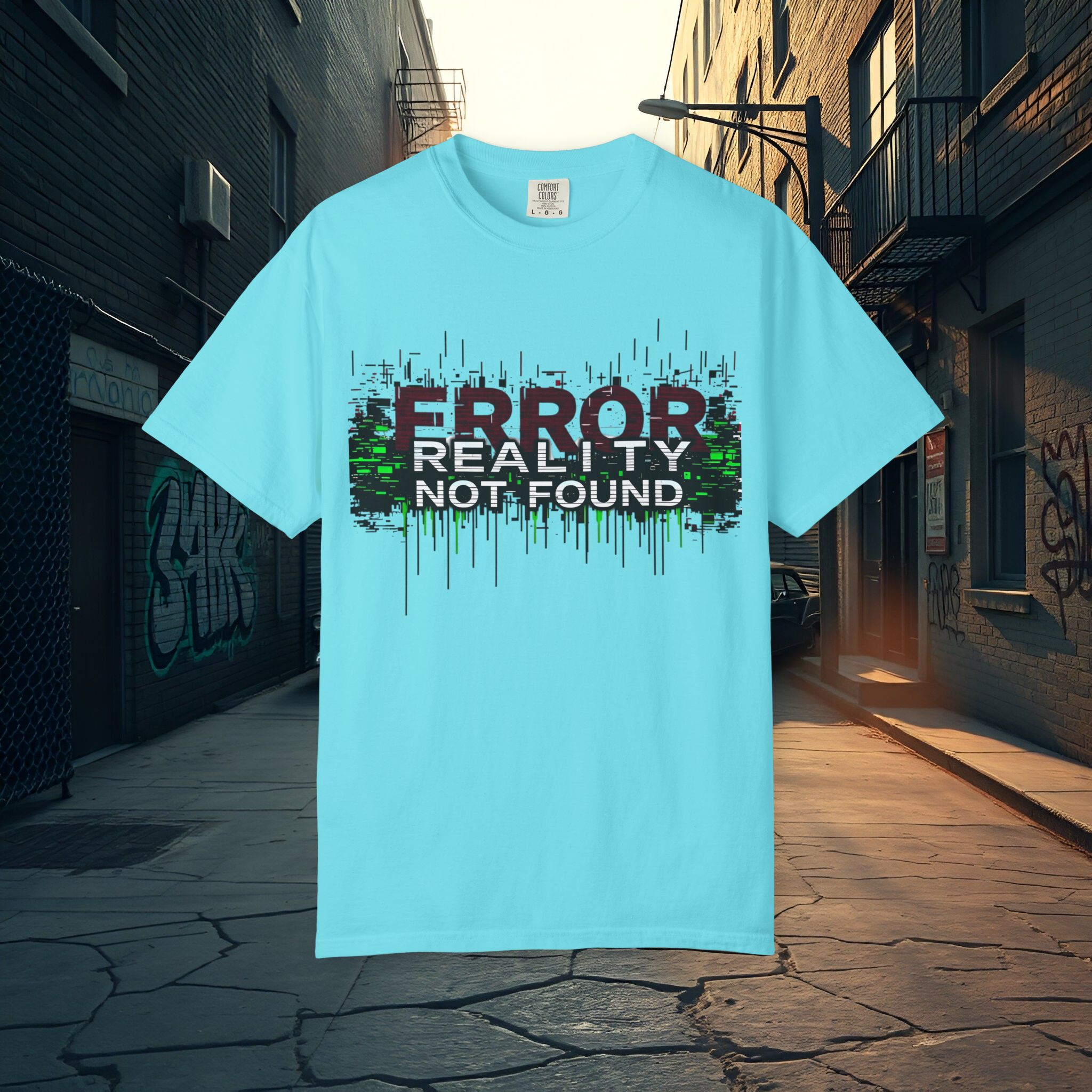 error reality not found t-shirt is the perfect blend of tech humor and vintage comfort. The bold “ERROR: REALITY NOT FOUND” print plays on 404 culture and simulation jokes, making this tee a standout gift for gamers, coders, and meme fans. Because each garment is garment-dyed and prewashed, every shirt has subtle tonal variations that give it a unique, lived-in character.