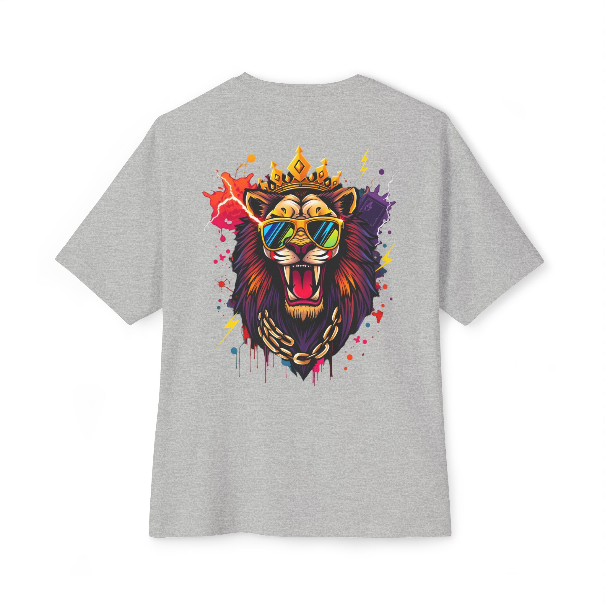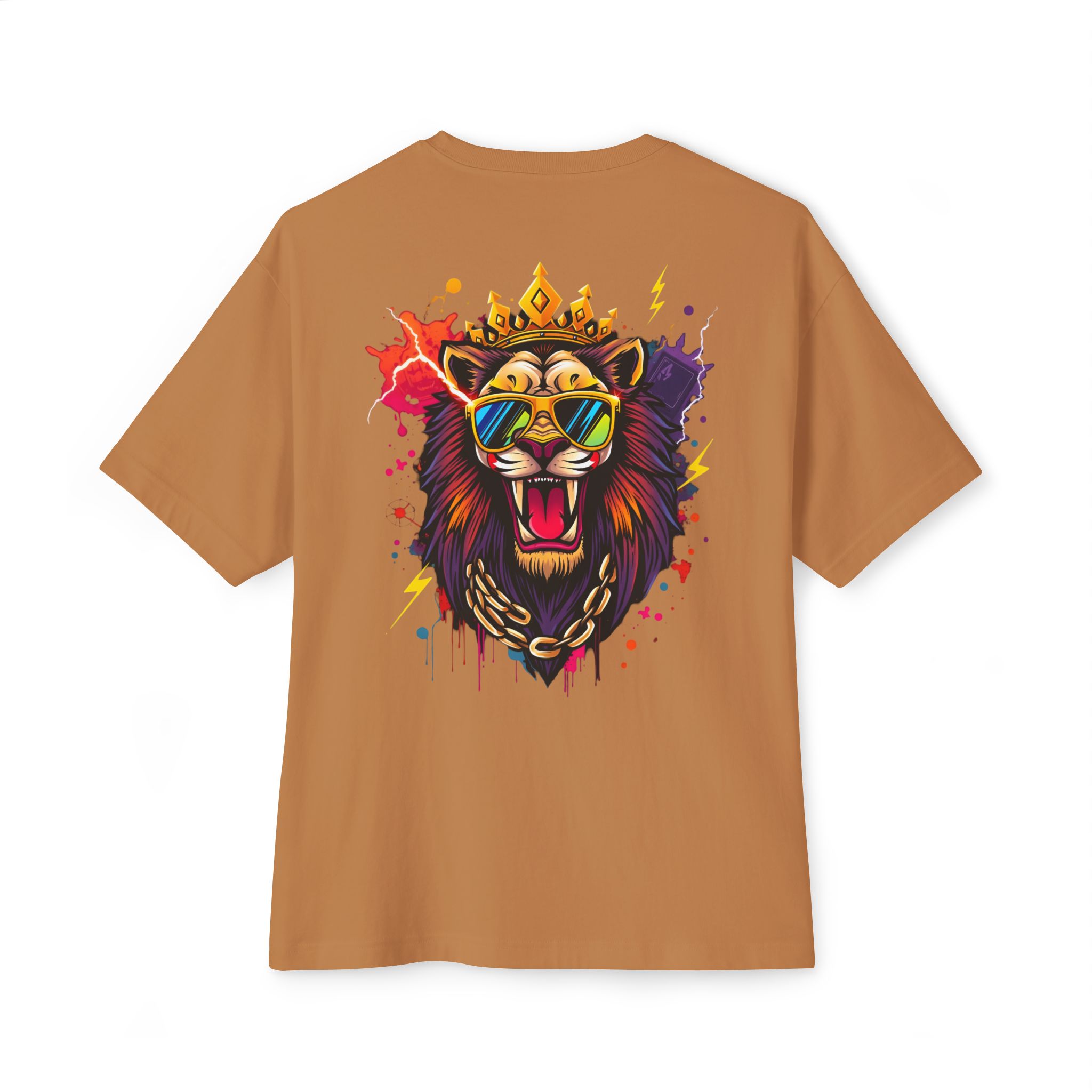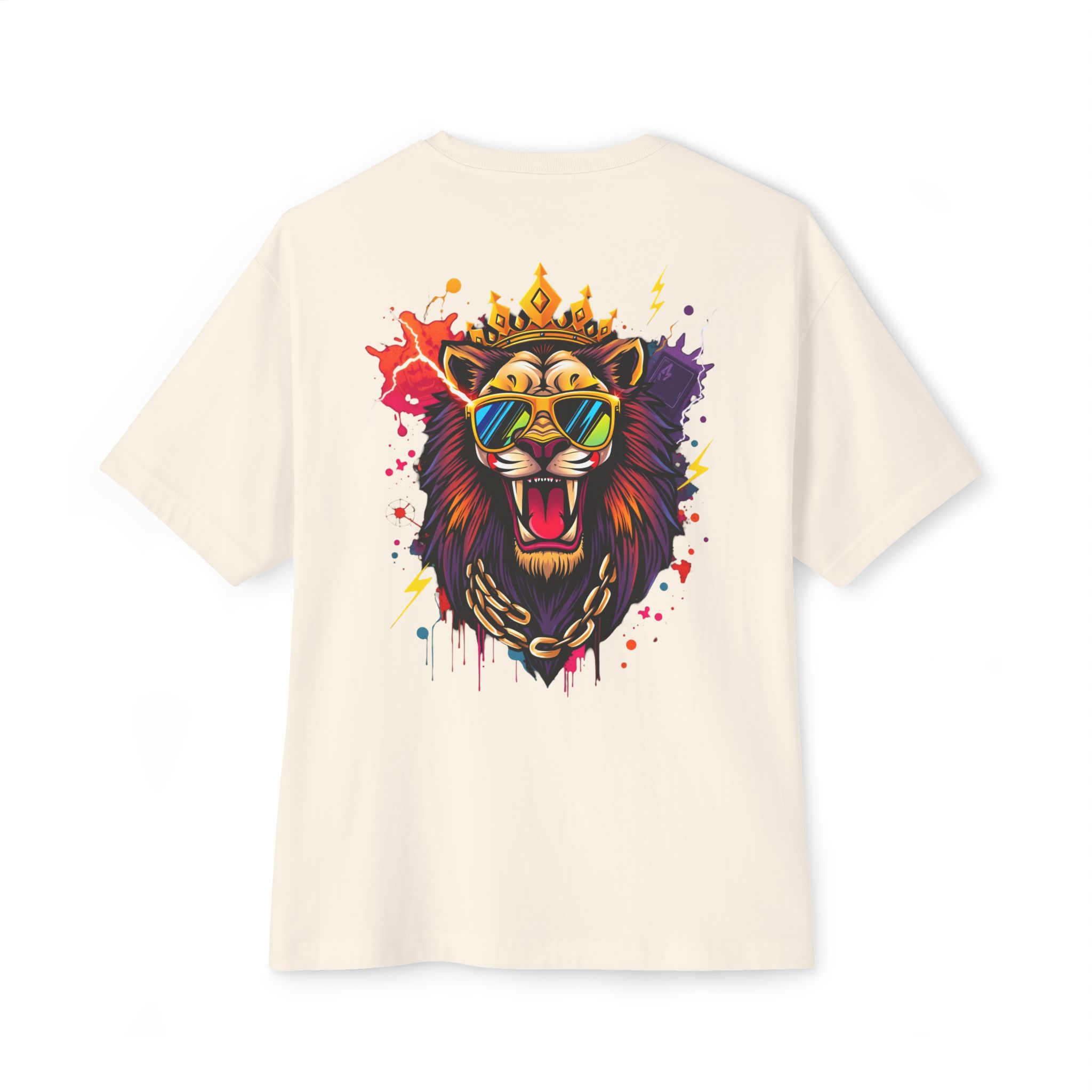 The lion graphic is optimized for high-contrast printing and scales well across thumbnails and hero images. For large-format boxy tees, use DTG or DTF depending on blank and production partner — test prints for soft-hand feel and color fidelity. Avoid over-saturating ink on vintage-washed or pigment-dyed blanks so the fabric hand remains soft.