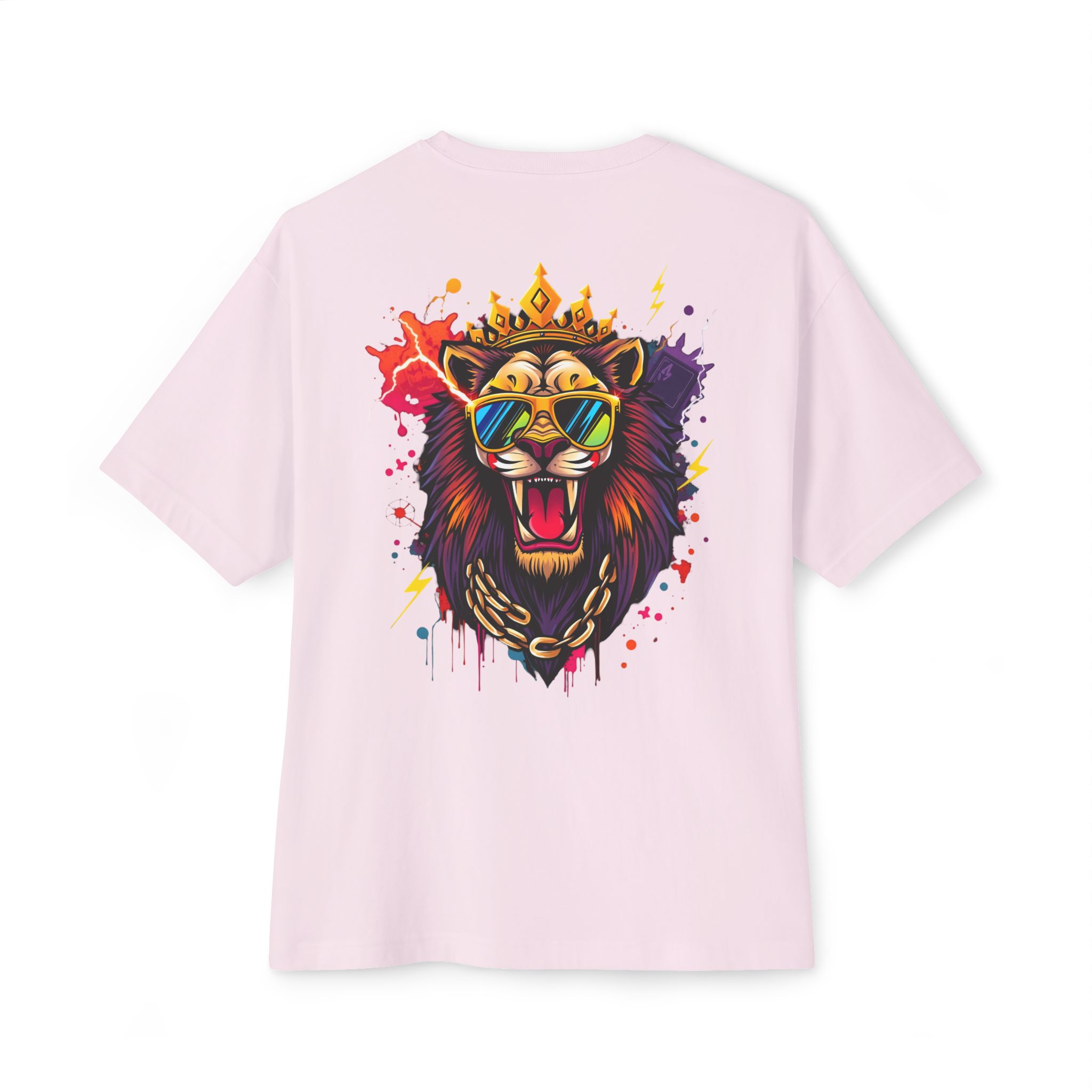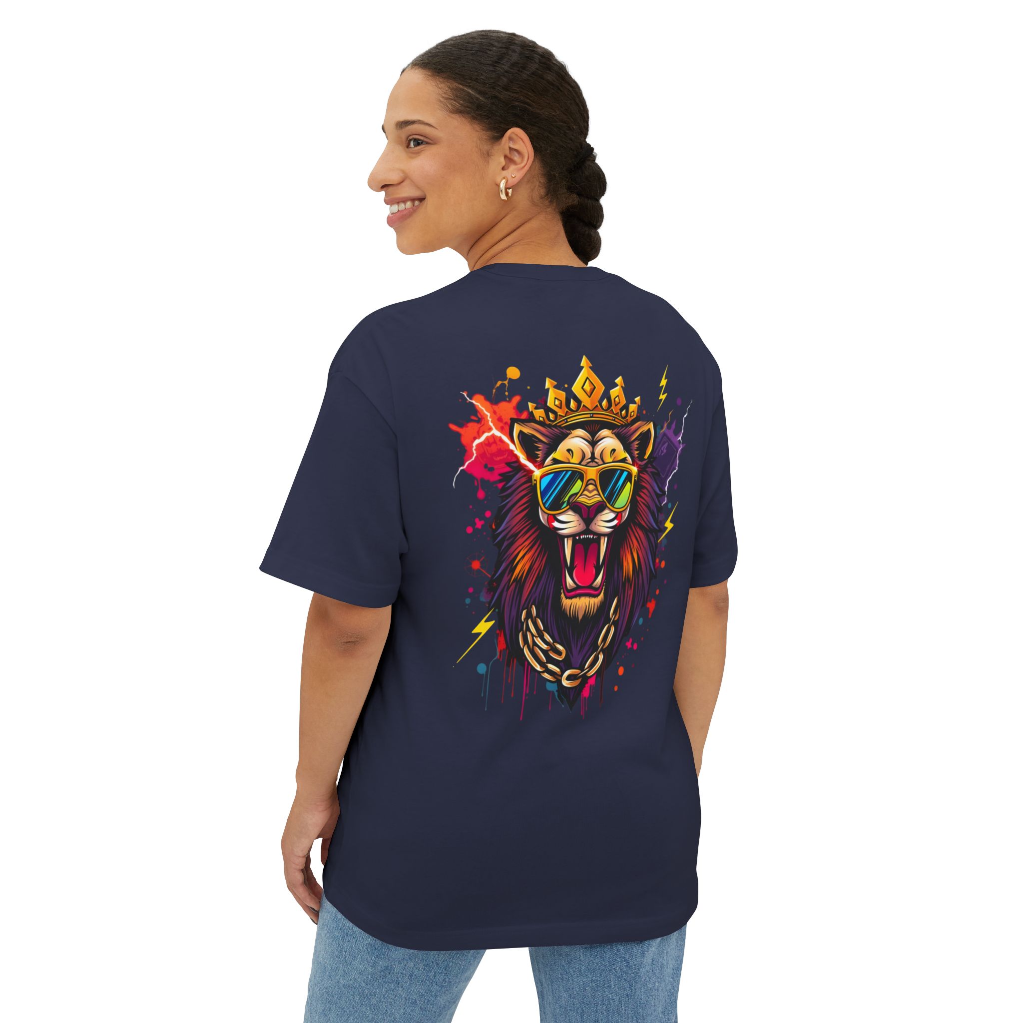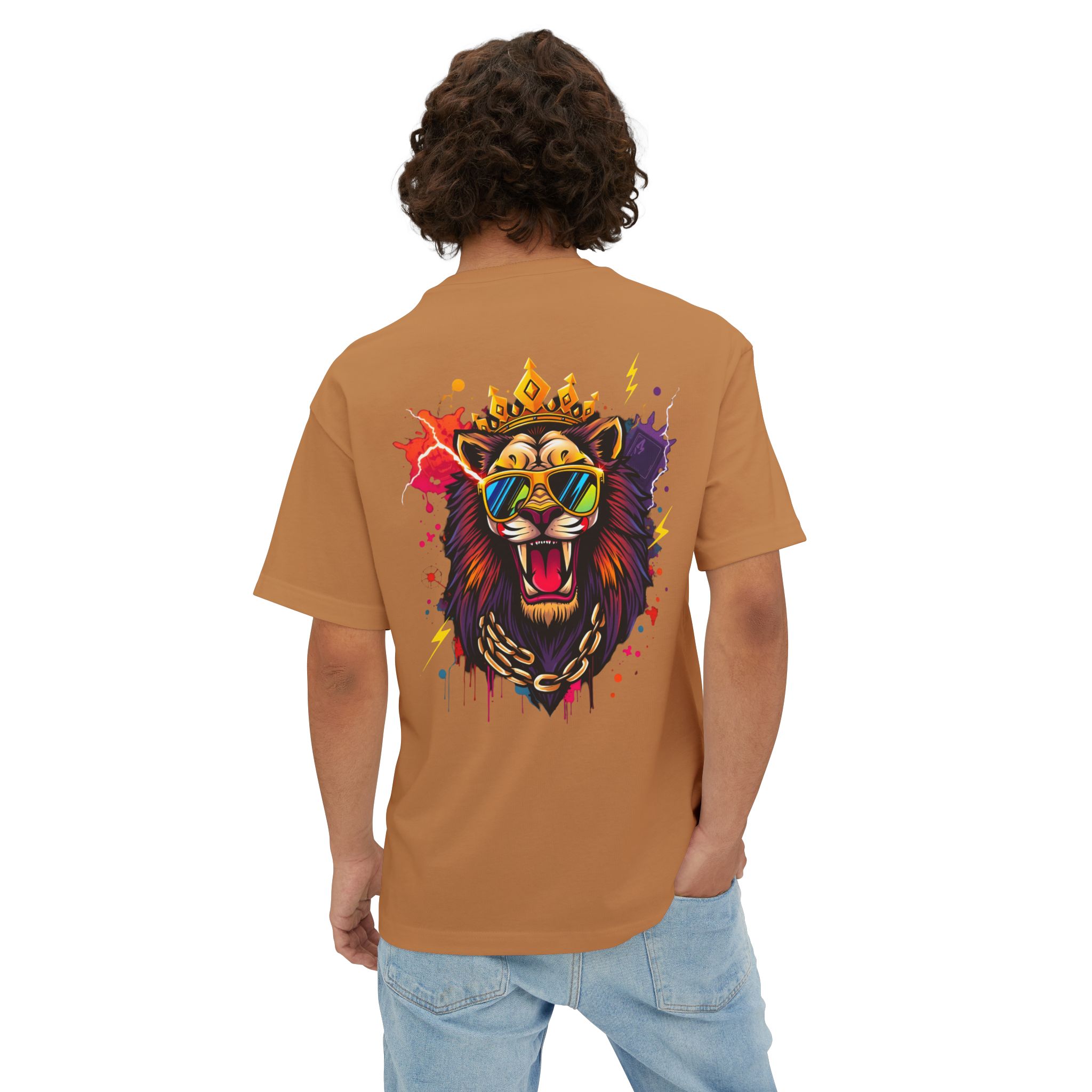 The lion graphic is optimized for high-contrast printing and scales well across thumbnails and hero images. For large-format boxy tees, use DTG or DTF depending on blank and production partner — test prints for soft-hand feel and color fidelity. Avoid over-saturating ink on vintage-washed or pigment-dyed blanks so the fabric hand remains soft.
