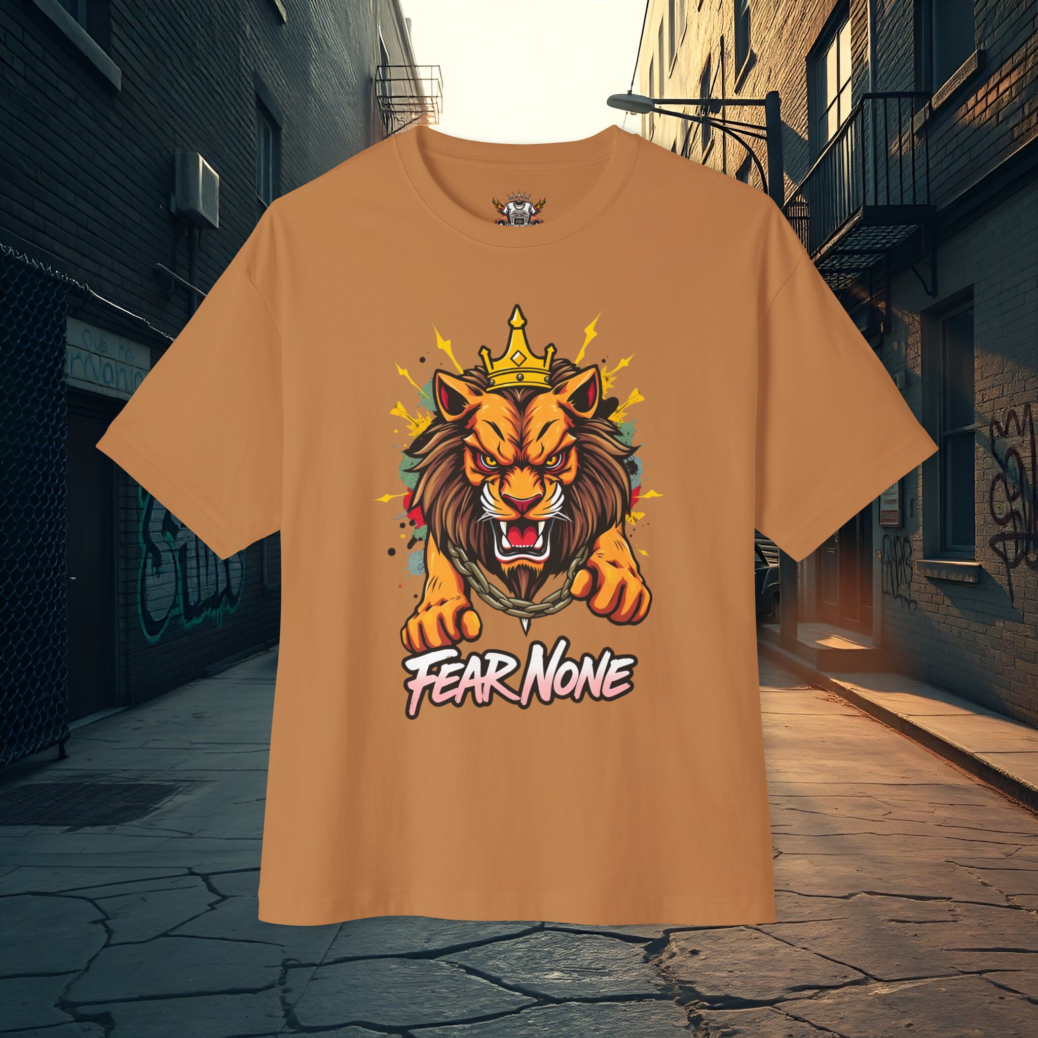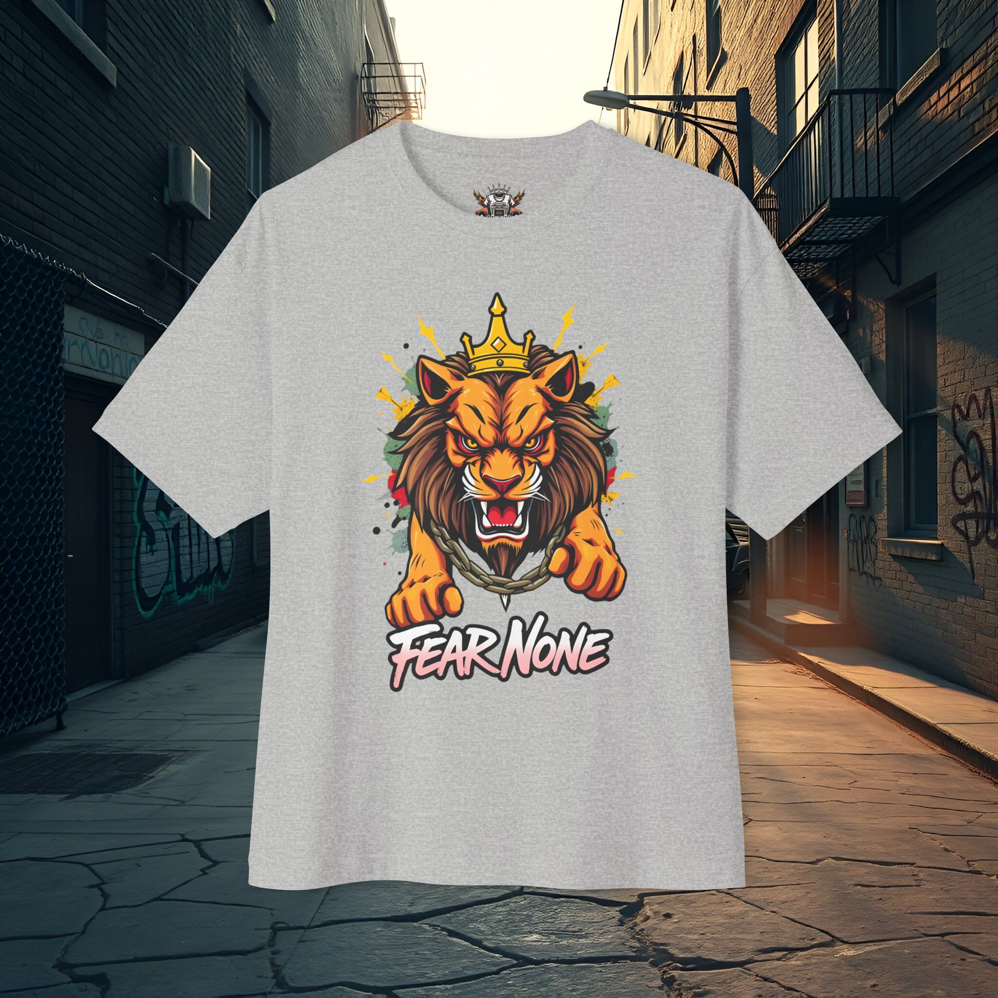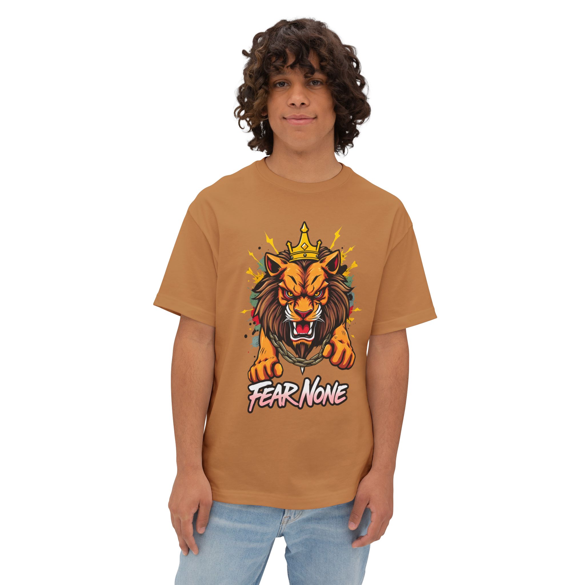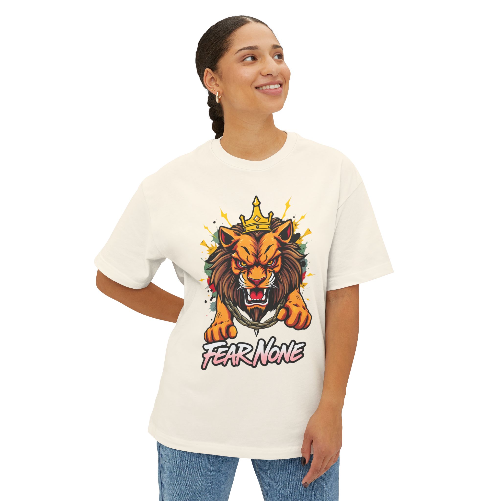 Command attention with the Fear None Lion T-Shirt — a bold unisex oversized boxy tee built to make a statement. The Fear None Lion T-Shirt pairs a striking lion graphic with a relaxed boxy silhouette that reads well in thumbnails, social posts, and festival feeds. This tee is designed to work as both streetwear and casual everyday wear: wear it solo with denim or layer under a shacket for colder months.