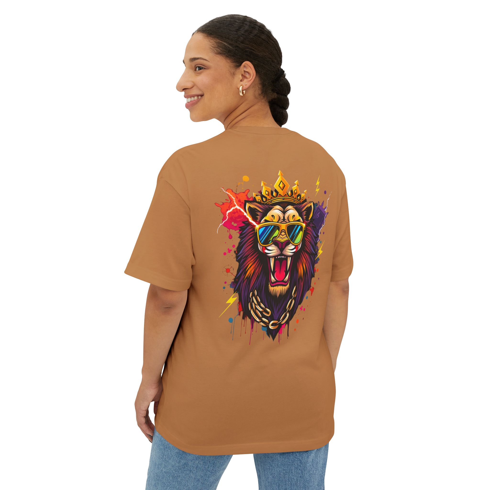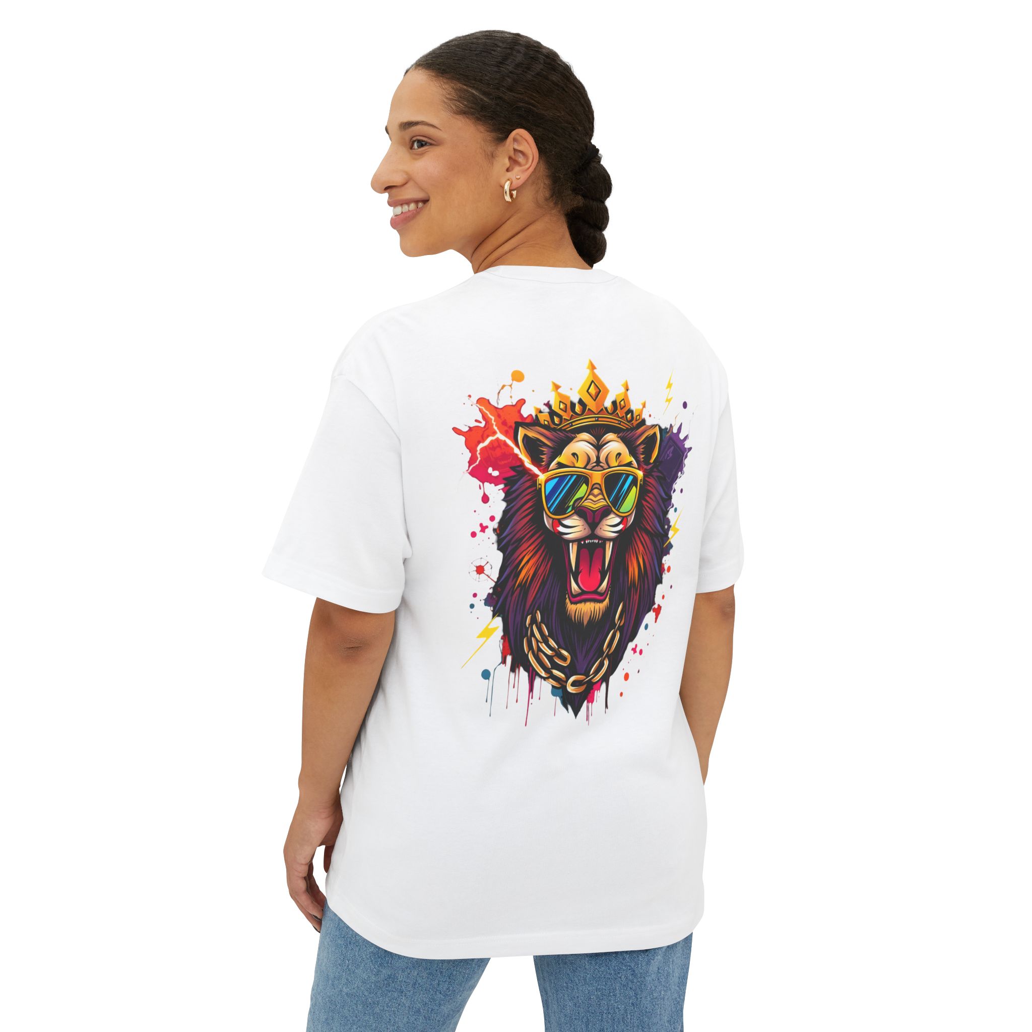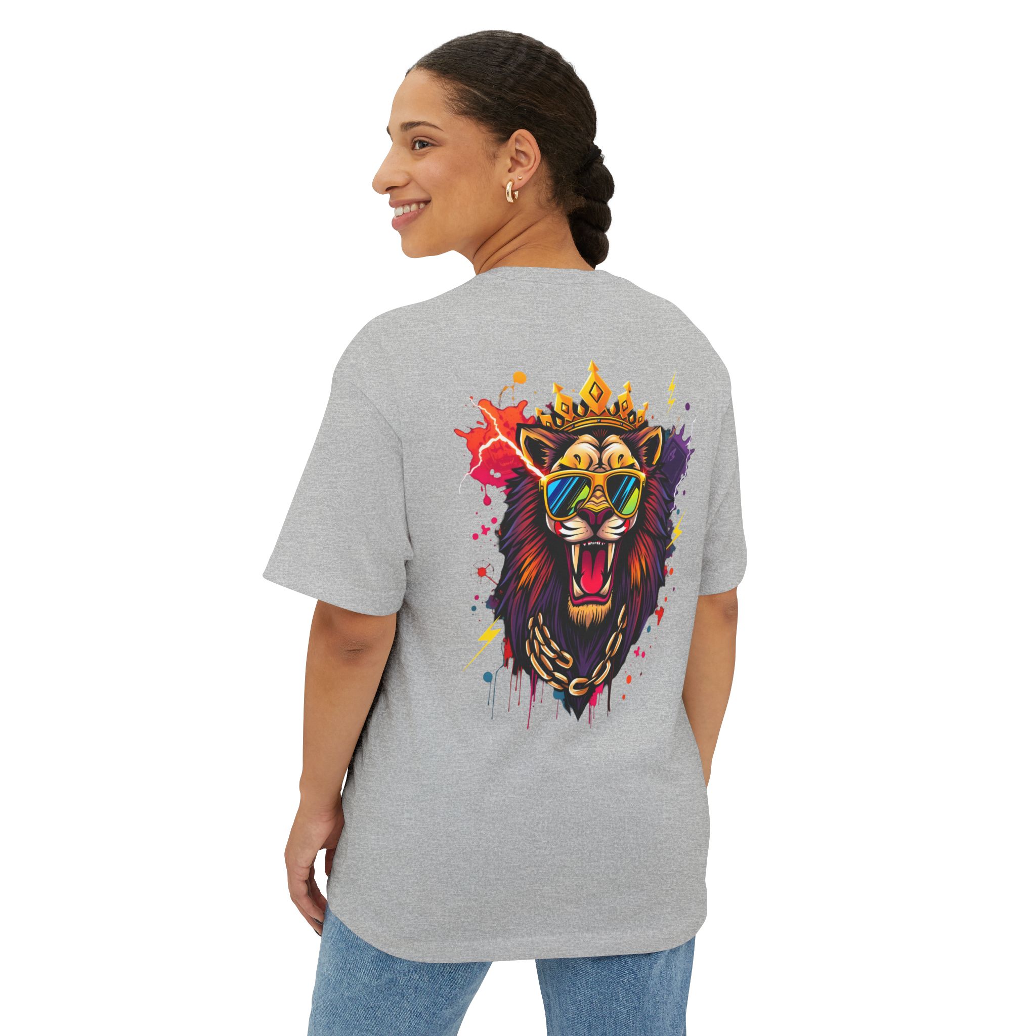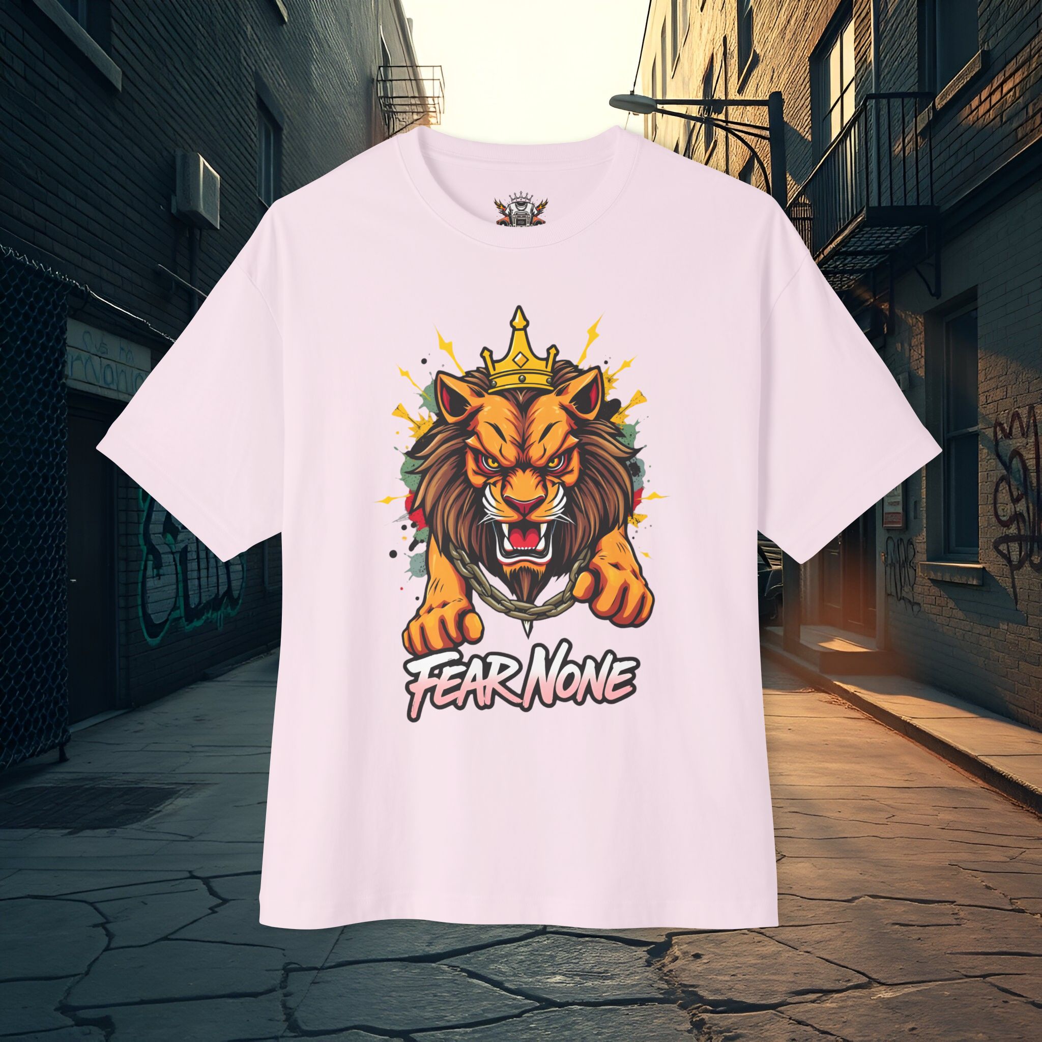 Command attention with the Fear None Lion T-Shirt — a bold unisex oversized boxy tee built to make a statement. The Fear None Lion T-Shirt pairs a striking lion graphic with a relaxed boxy silhouette that reads well in thumbnails, social posts, and festival feeds. This tee is designed to work as both streetwear and casual everyday wear: wear it solo with denim or layer under a shacket for colder months.