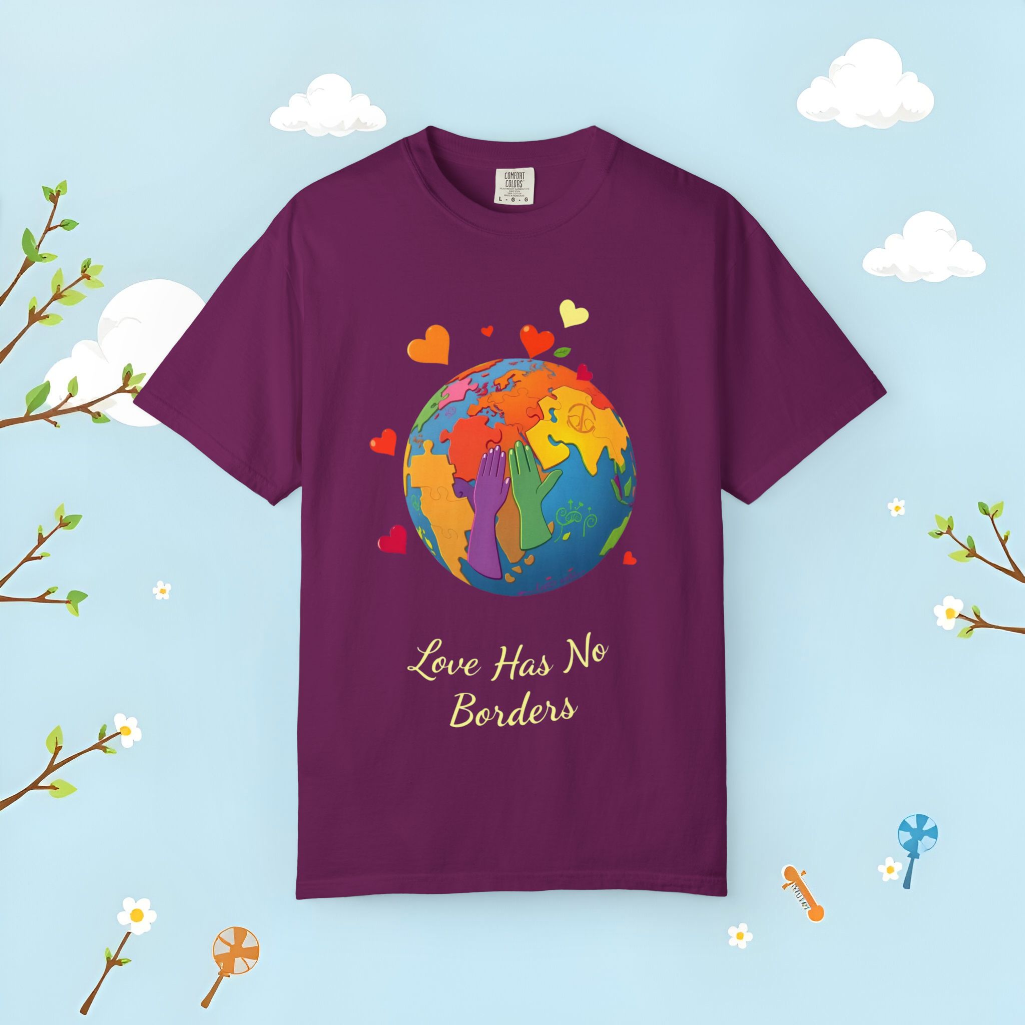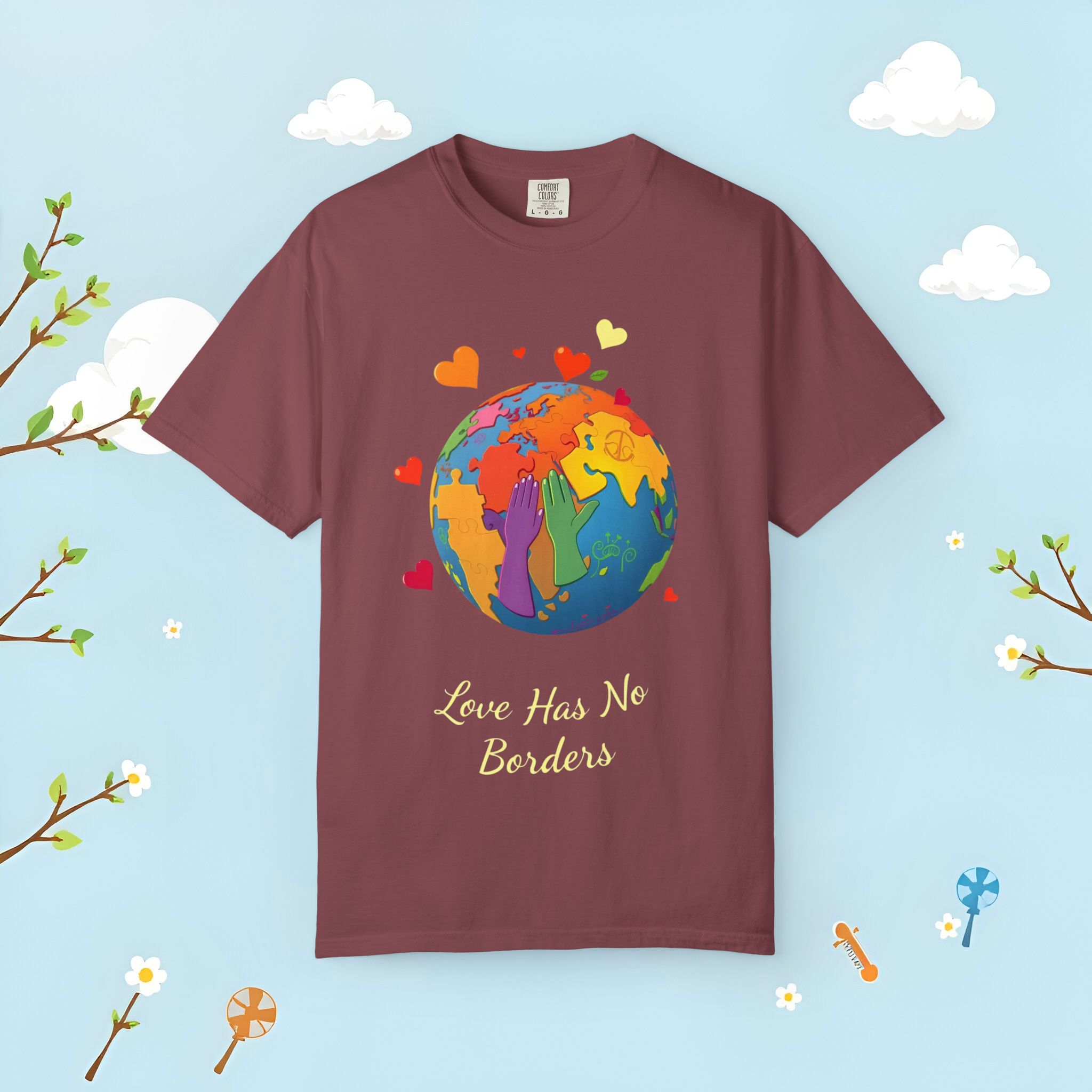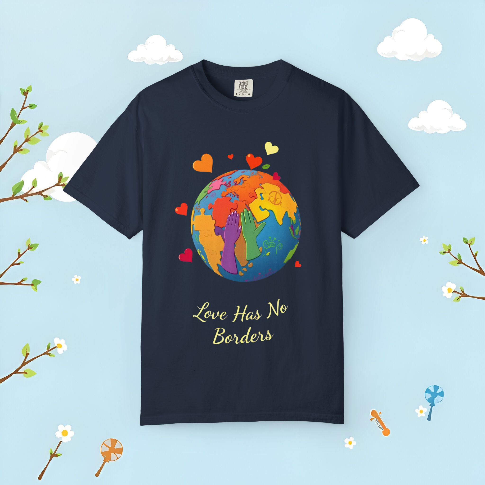 Love Has No Borders T-Shirt celebrates global unity with a vibrant, multi-colored globe and the uplifting message “Love Has No Borders.” This garment-dyed unisex tee offers a soft hand-feel, rich color saturation, and a relaxed fit that’s perfect for travel lovers, activists, and community events. The friendly artwork and heart motifs make it an easy pick for Earth Day, cultural festivals, and multicultural occasions.