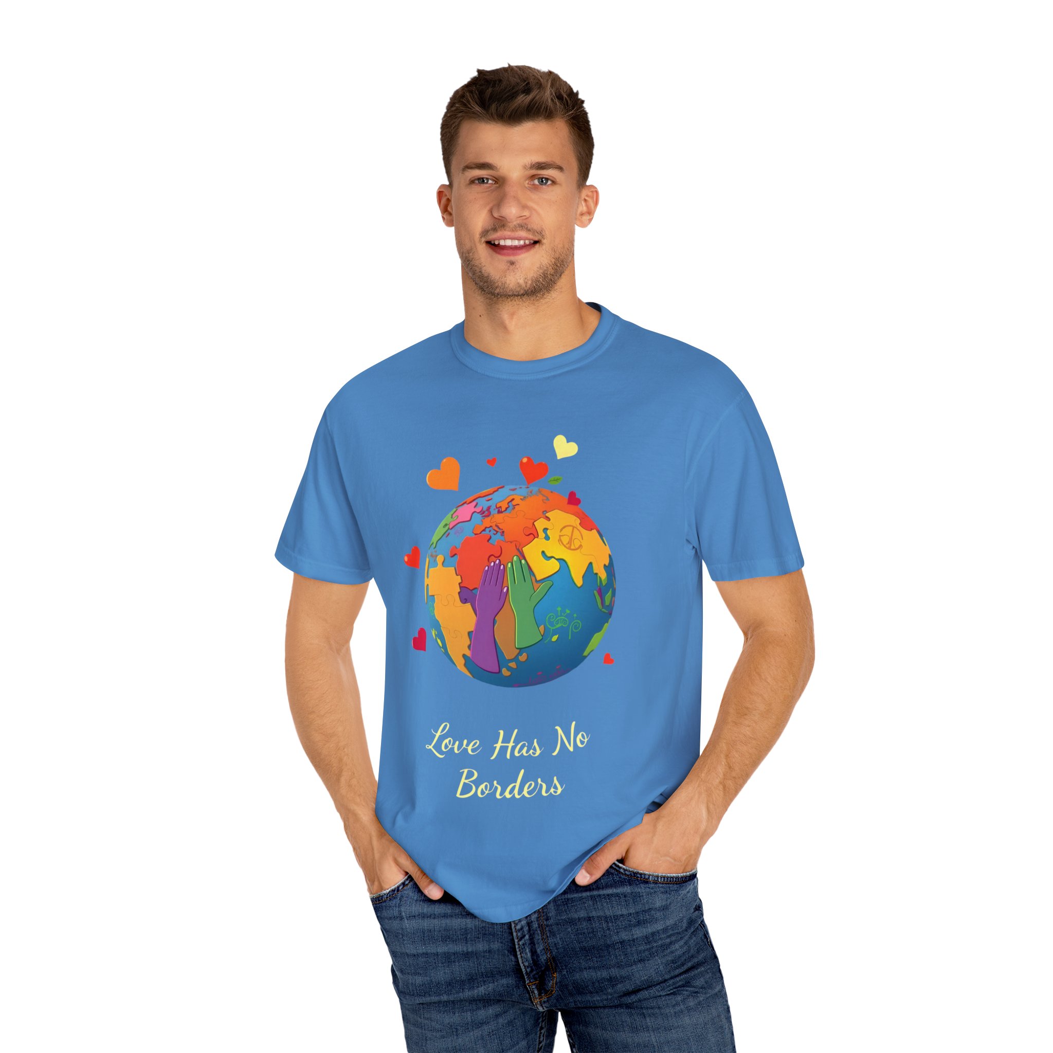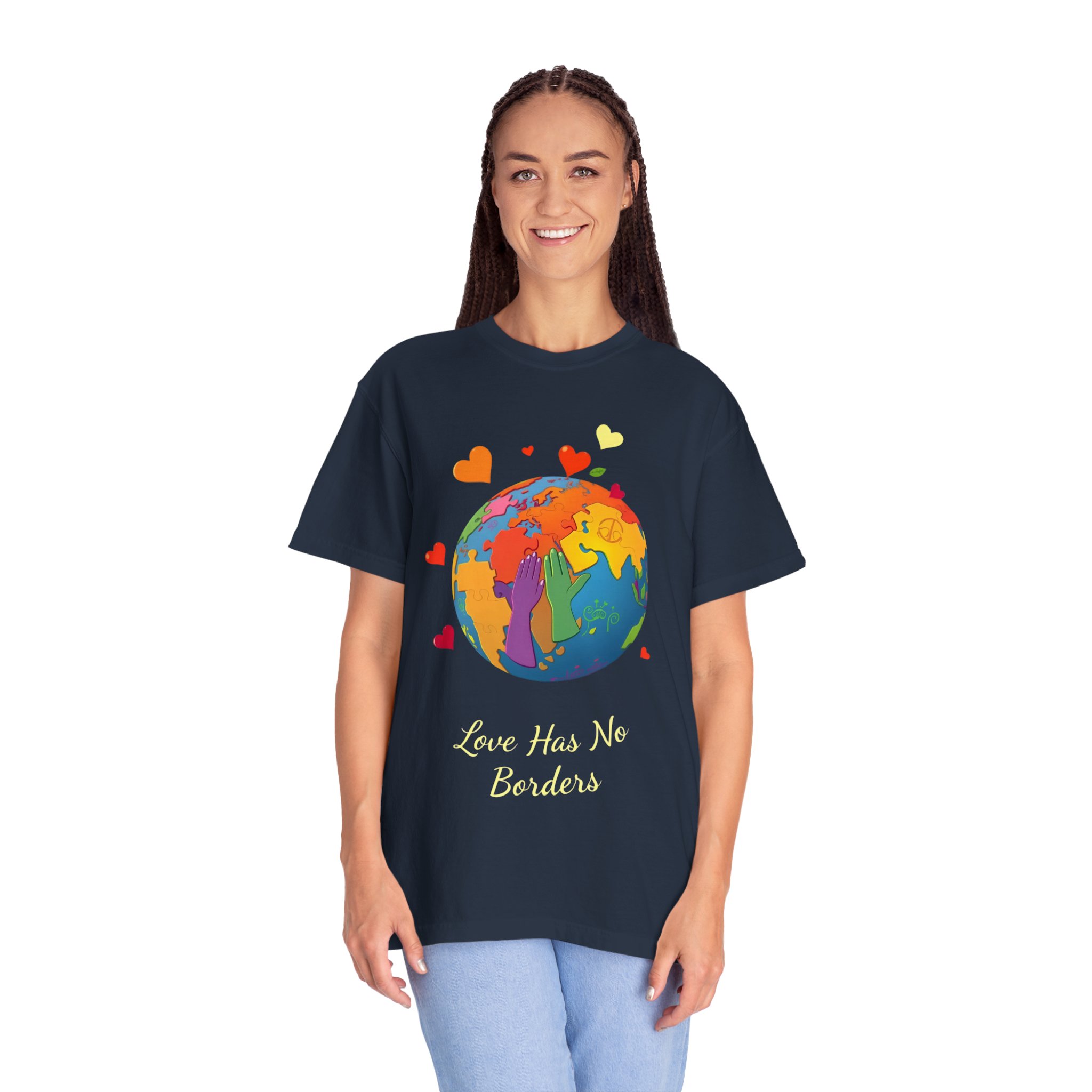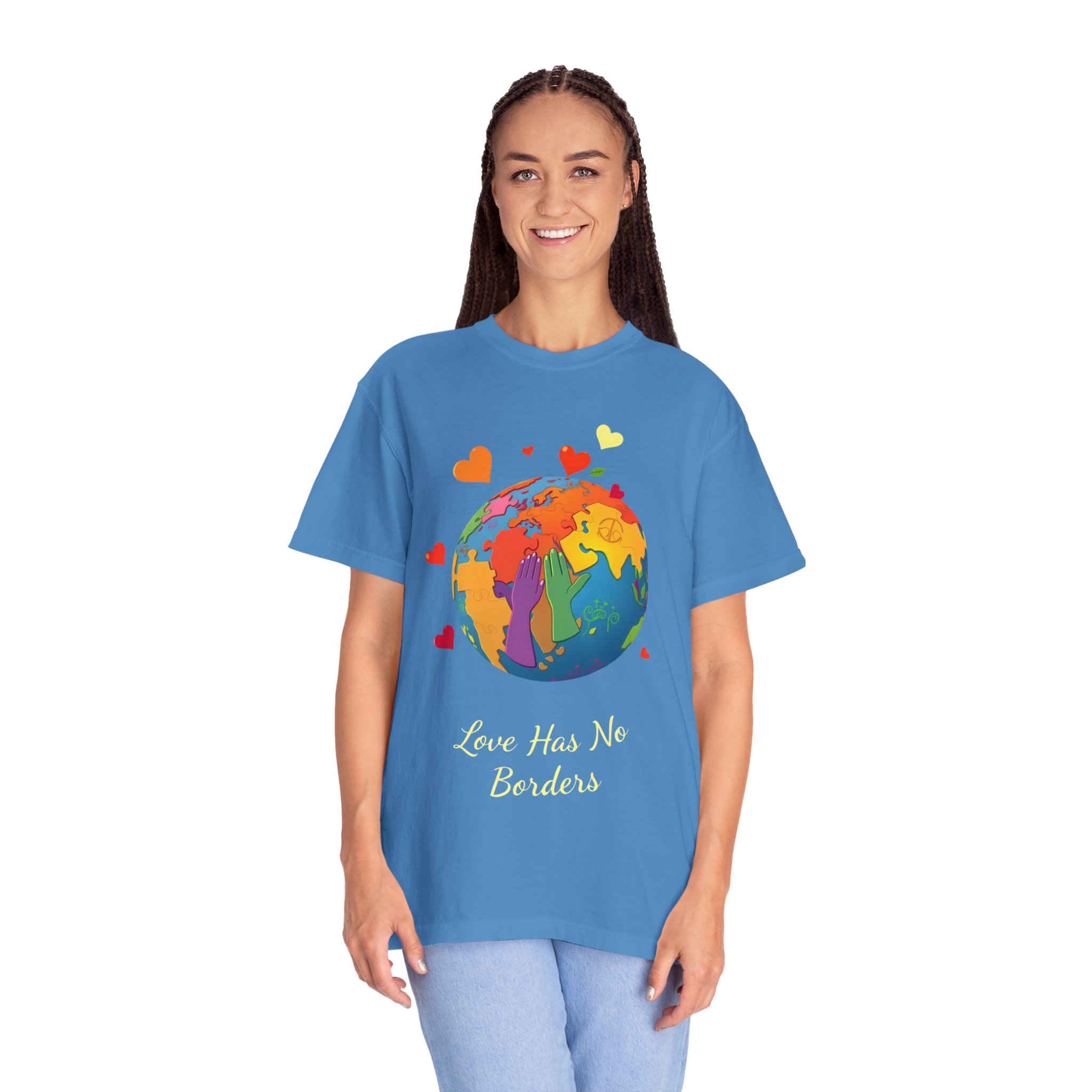 friendly t shirt, love has no borders unisex t shirt, colorful earth love shirt for travel lovers, multicultural love t shirt earth design, love has no borders earth day tee, sustainable garment dyed love shirt,
