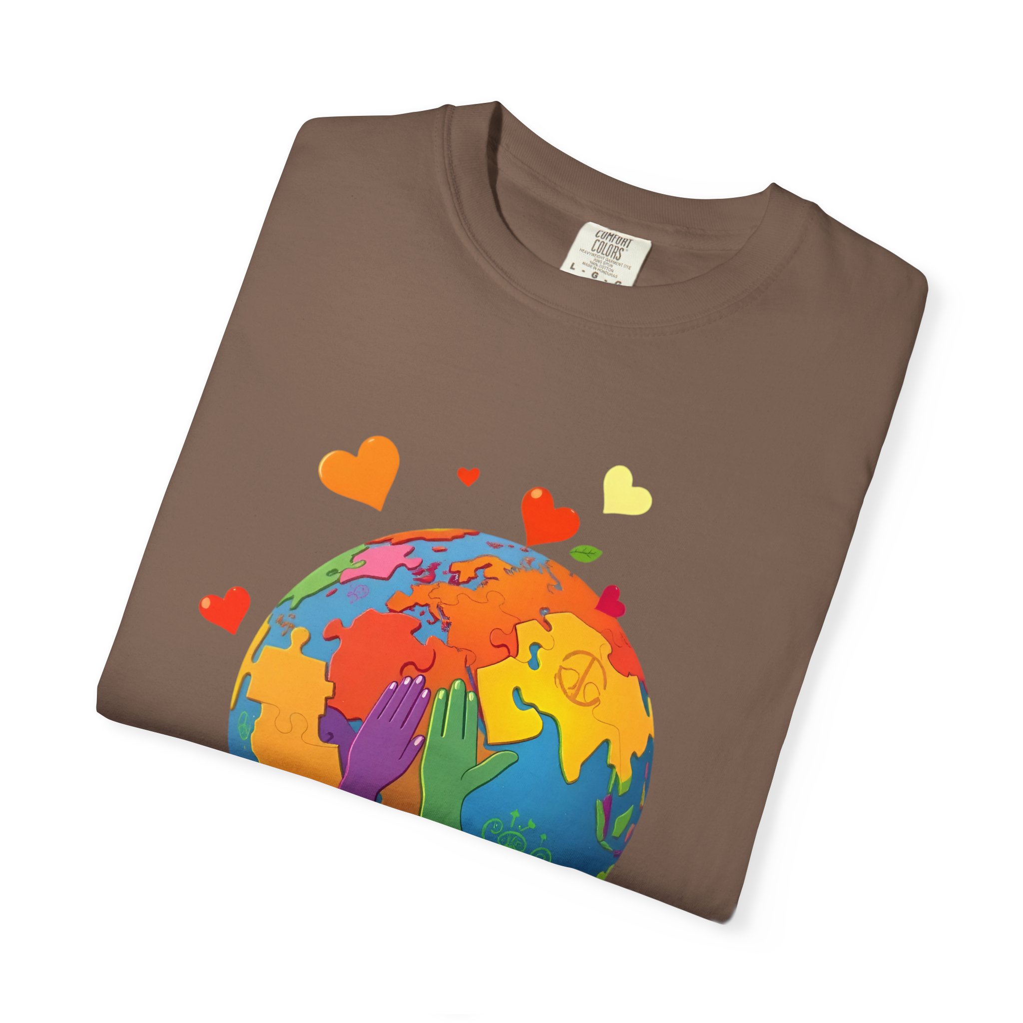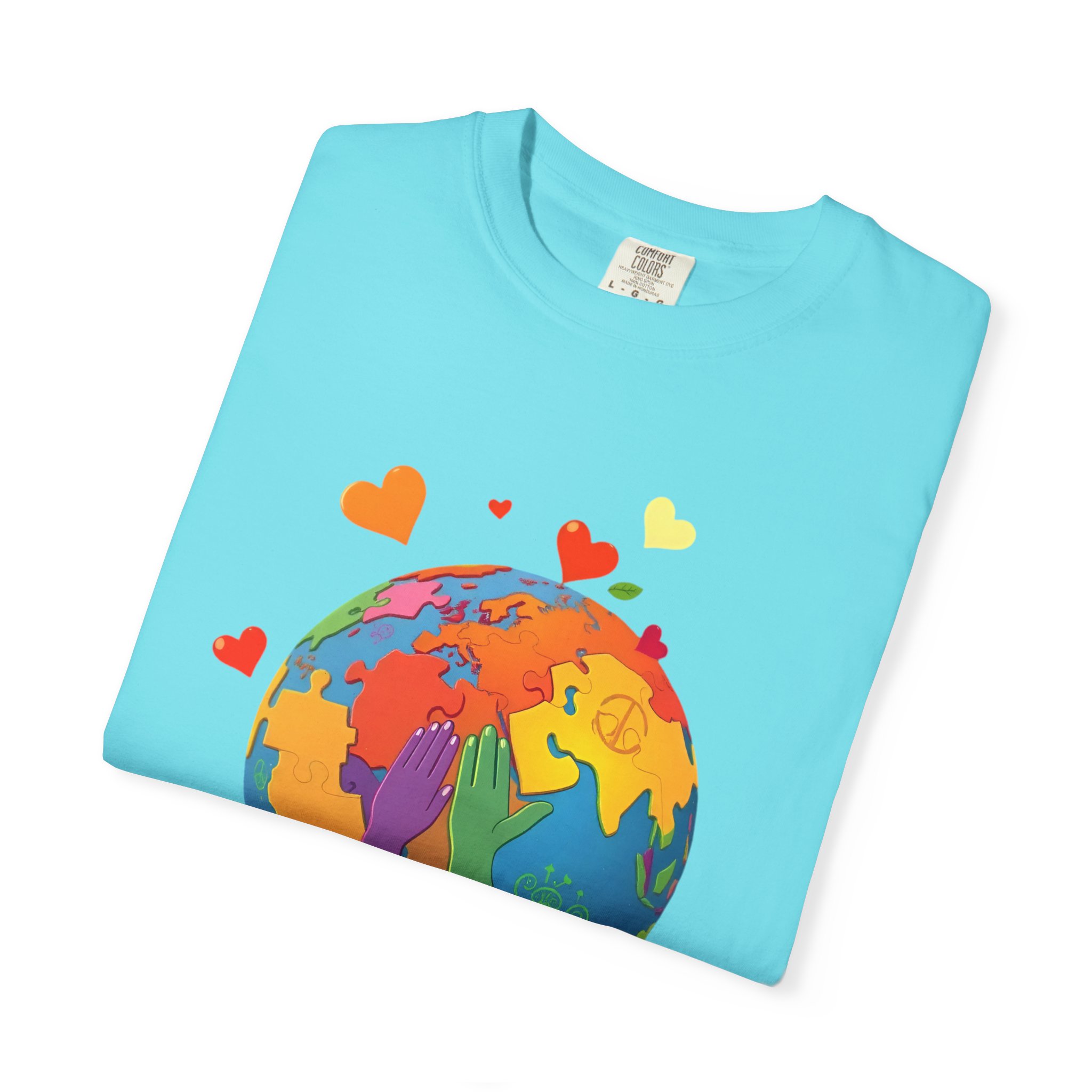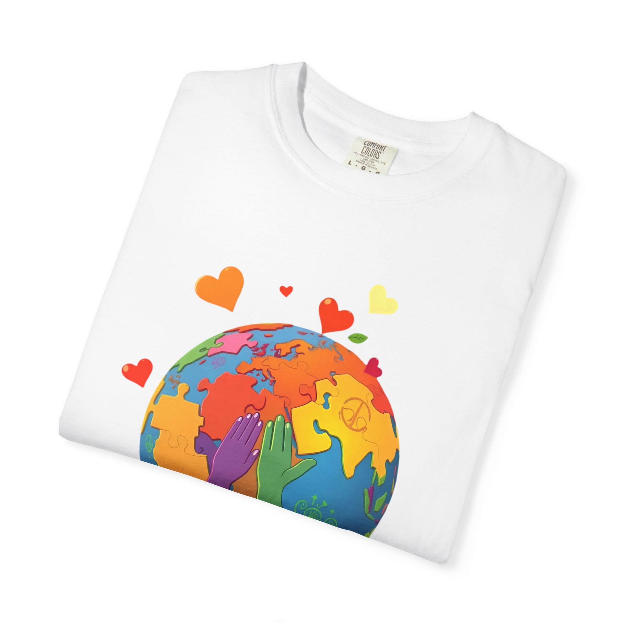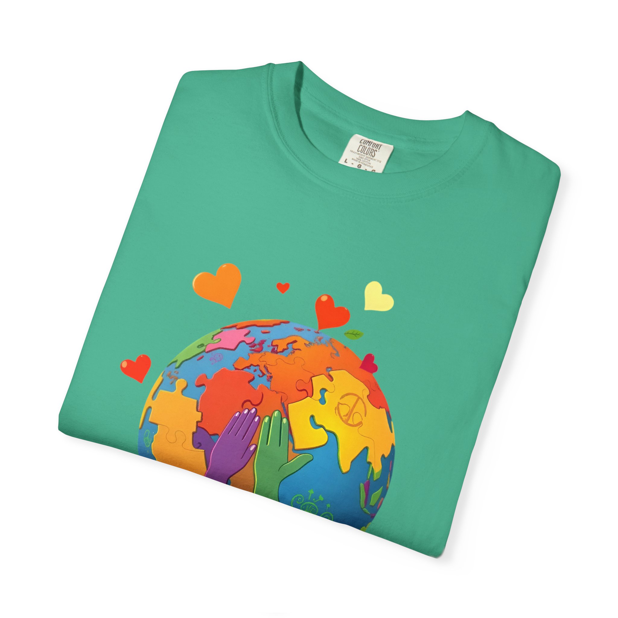 garment-dyed t shirt, unisex garment dyed tee, pre-shrunk cotton tee, double needle stitching shirt, seamless tubular tee, colorful print t shirt, travel graphic tee, world map t shirt, rainbow earth tee, love globe shirt, hearts world tee, Etsy earth day shirt, Amazon earth t shirt, redbubble earth tee, sustainable fashion t shirt, eco