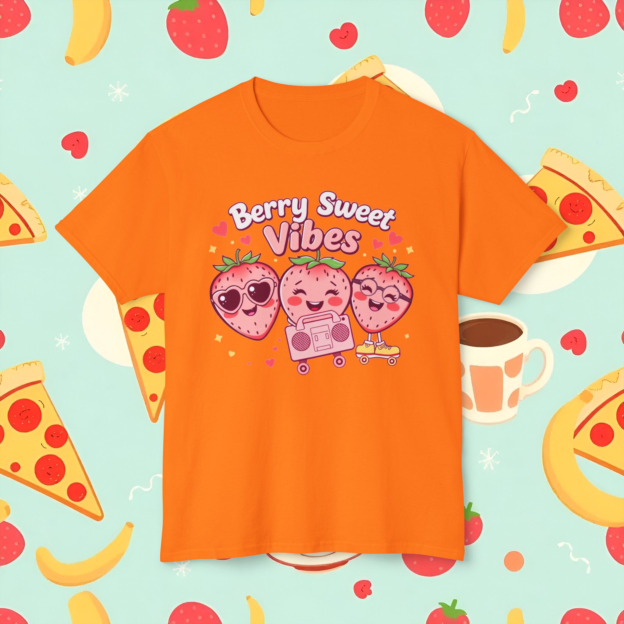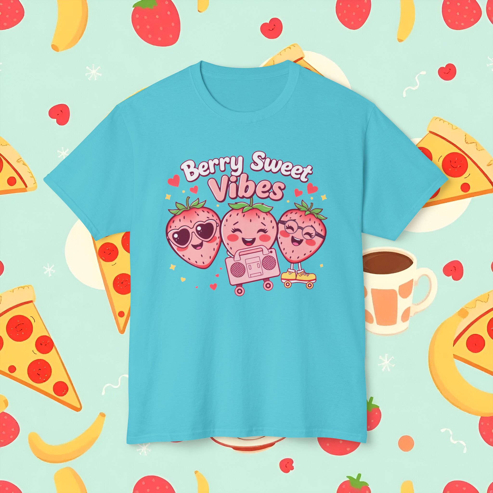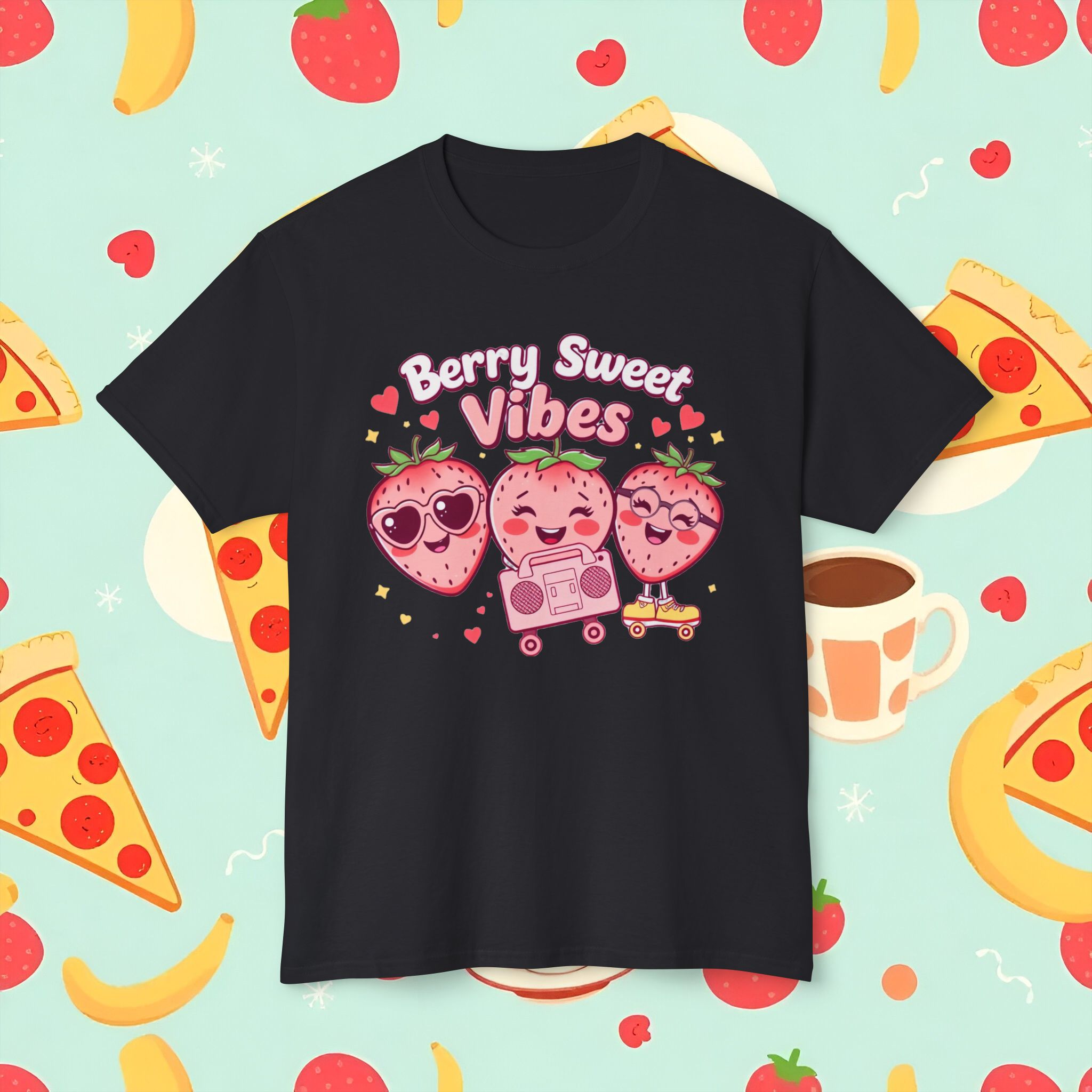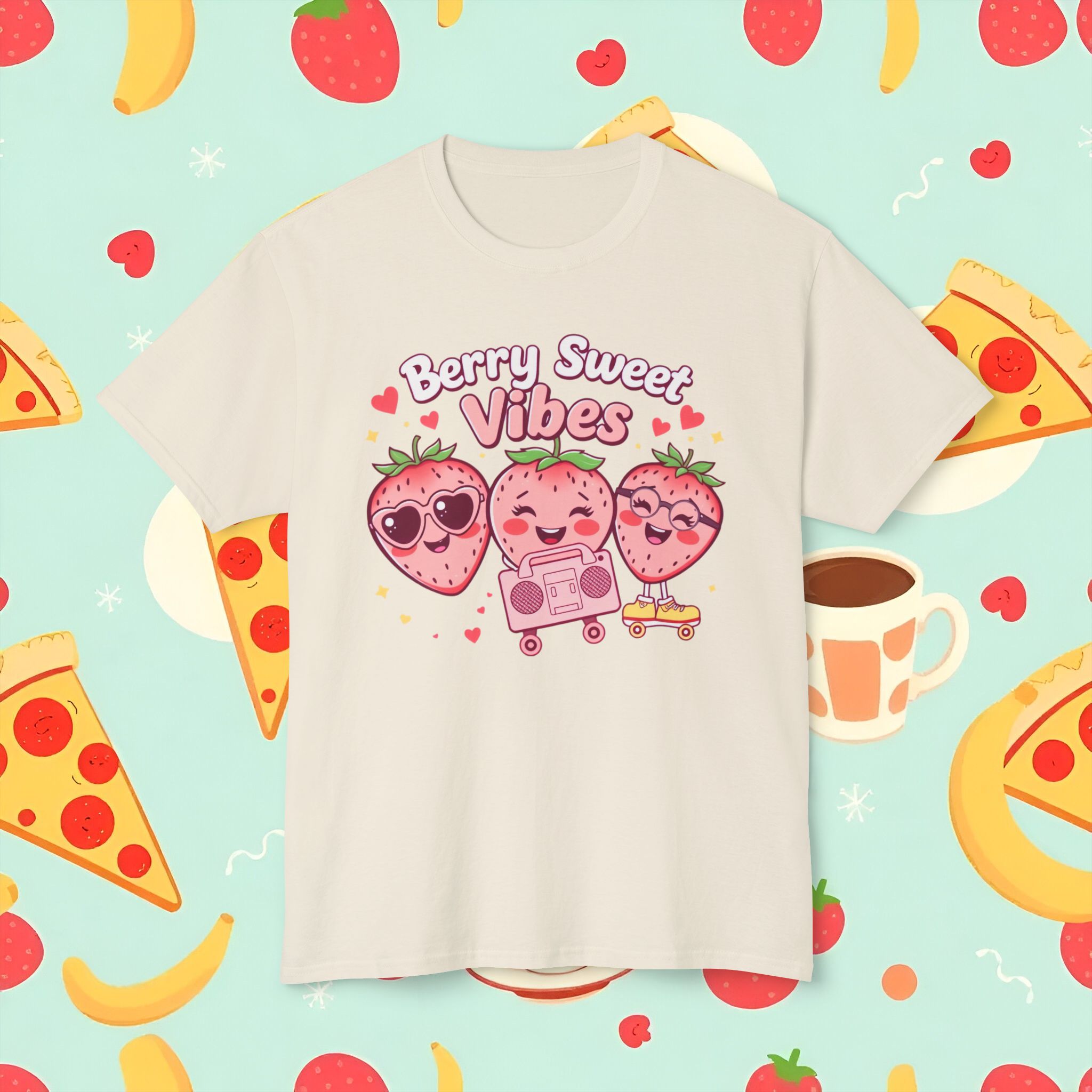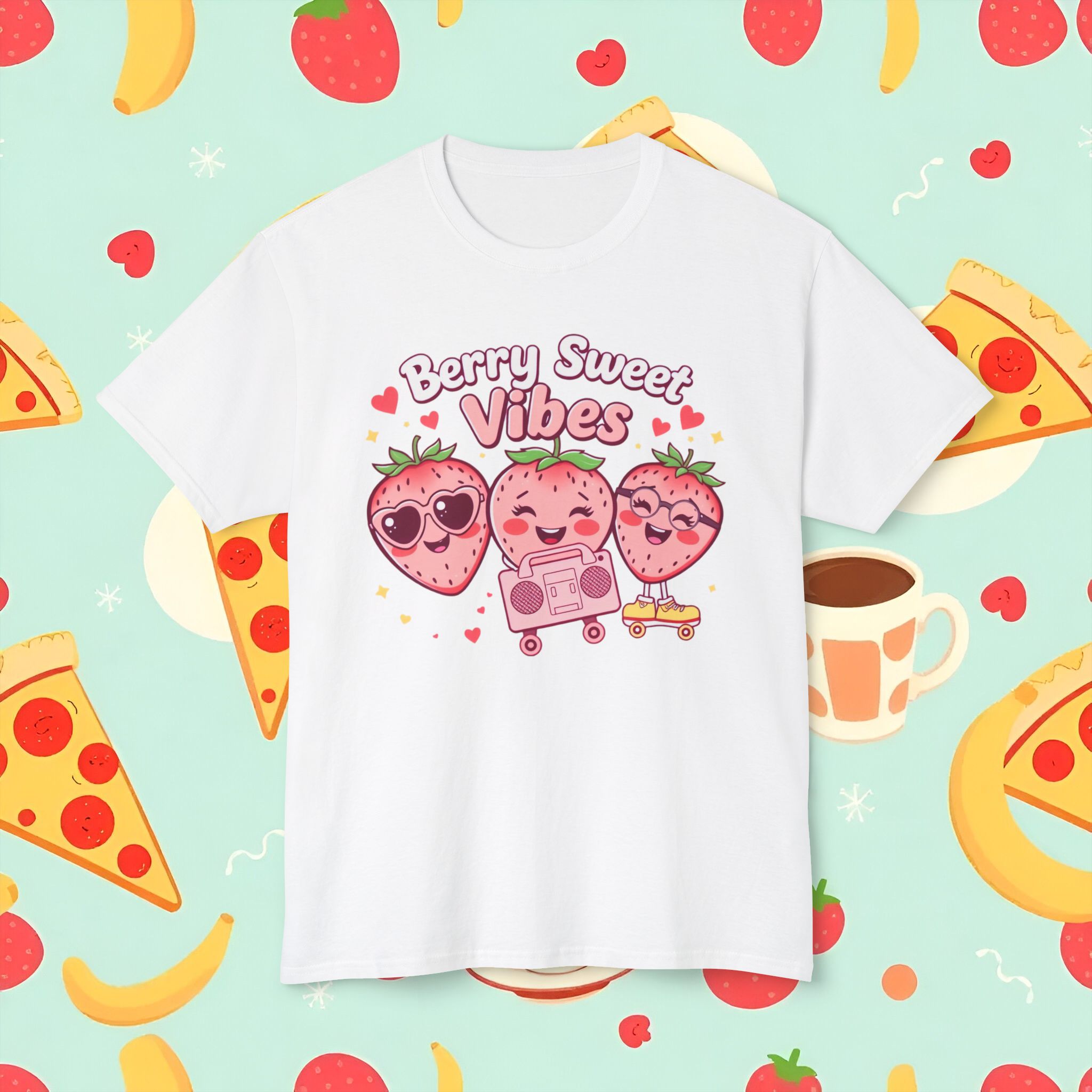 The design features three adorable strawberry characters and is printed centrally on every strawberry t-shirt we make — one with sunglasses, one with a boombox, and one on roller skates — set in a playful bubble-letter header that reads “Berry Sweet Vibes.” The palette works great on mustard yellow, soft pastels, white, and black bases, making this a versatile addition to capsule wardrobes. Pair this cute strawberry shirt with denim shorts, a mini skirt, or layer it under a blazer for an elevated casual look.