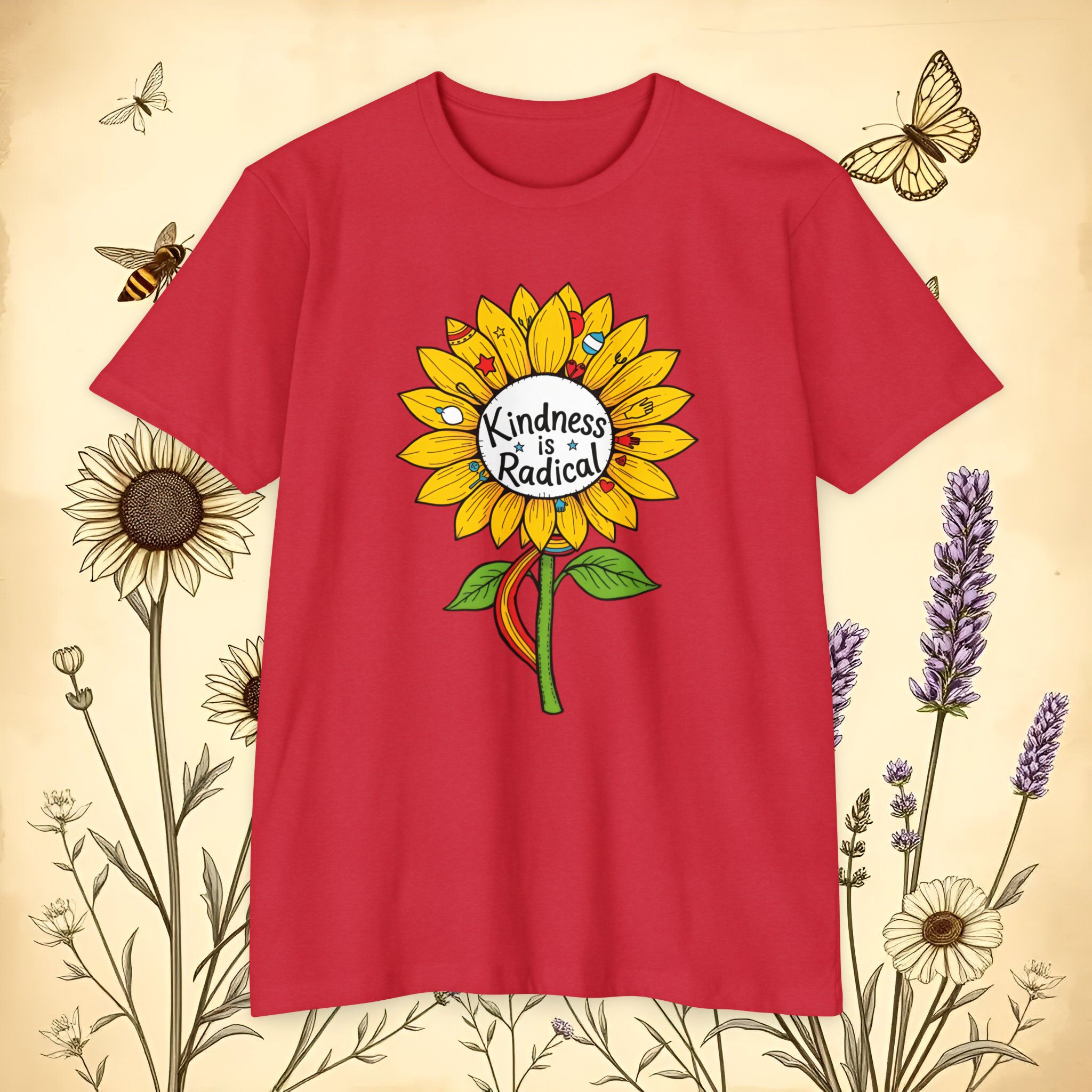 poly t shirt, lightweight graphic tee, festival graphic tee, teacher kindness shirt, good vibes t shirt, cute red graphic tee, sunflower t shirt women/men, sunflower tops for women, graphic tees for women/men, summer tees for women, casual printed t shirts, cotton polyester t shirt, botanical t shirt, flower tee,